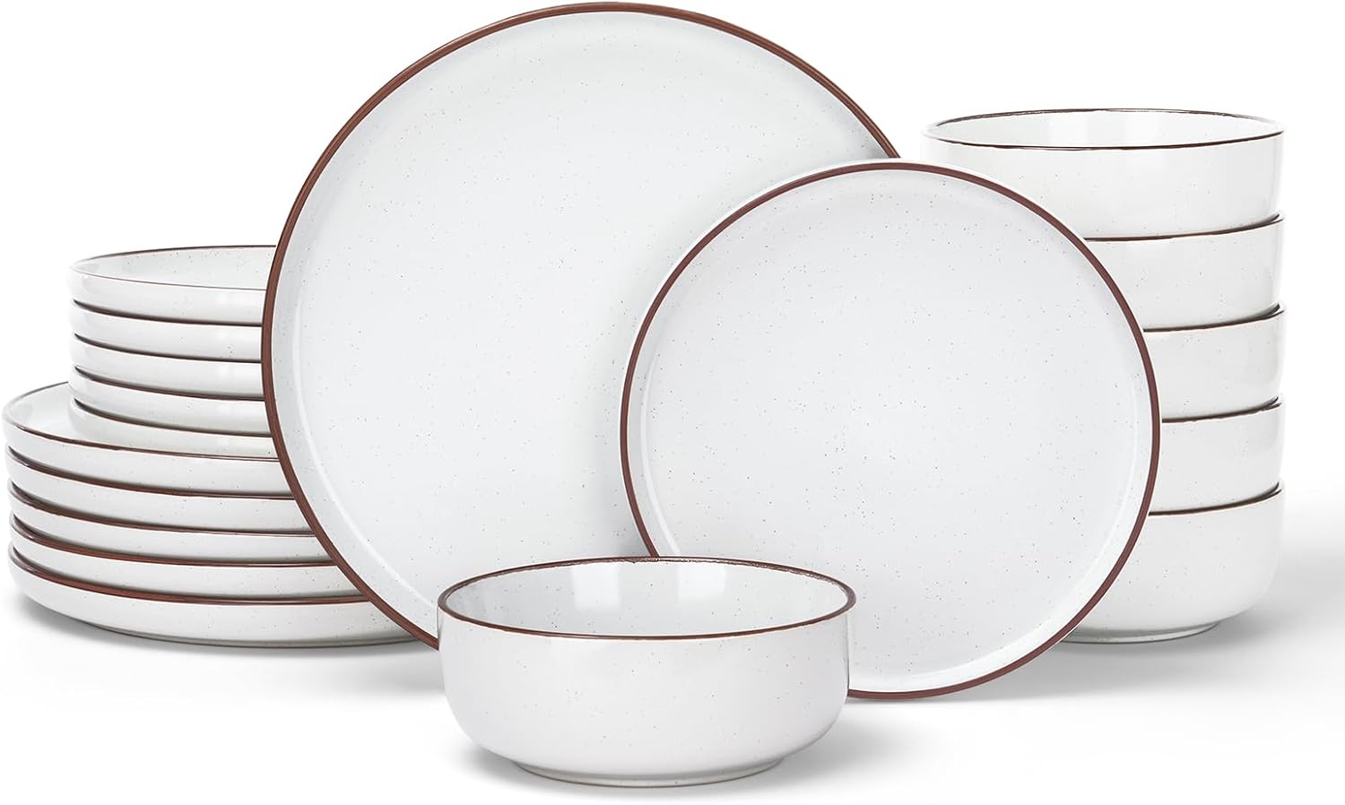 • 【AWESOME DESIGN】These rounded dishes are randomly scattered with speckled patterns of various sizes and shades, making each piece unique. The application of hand-crafted brown edges further adds an artistic touch to the series, creating a warm, elegant and romantic family dinner party.