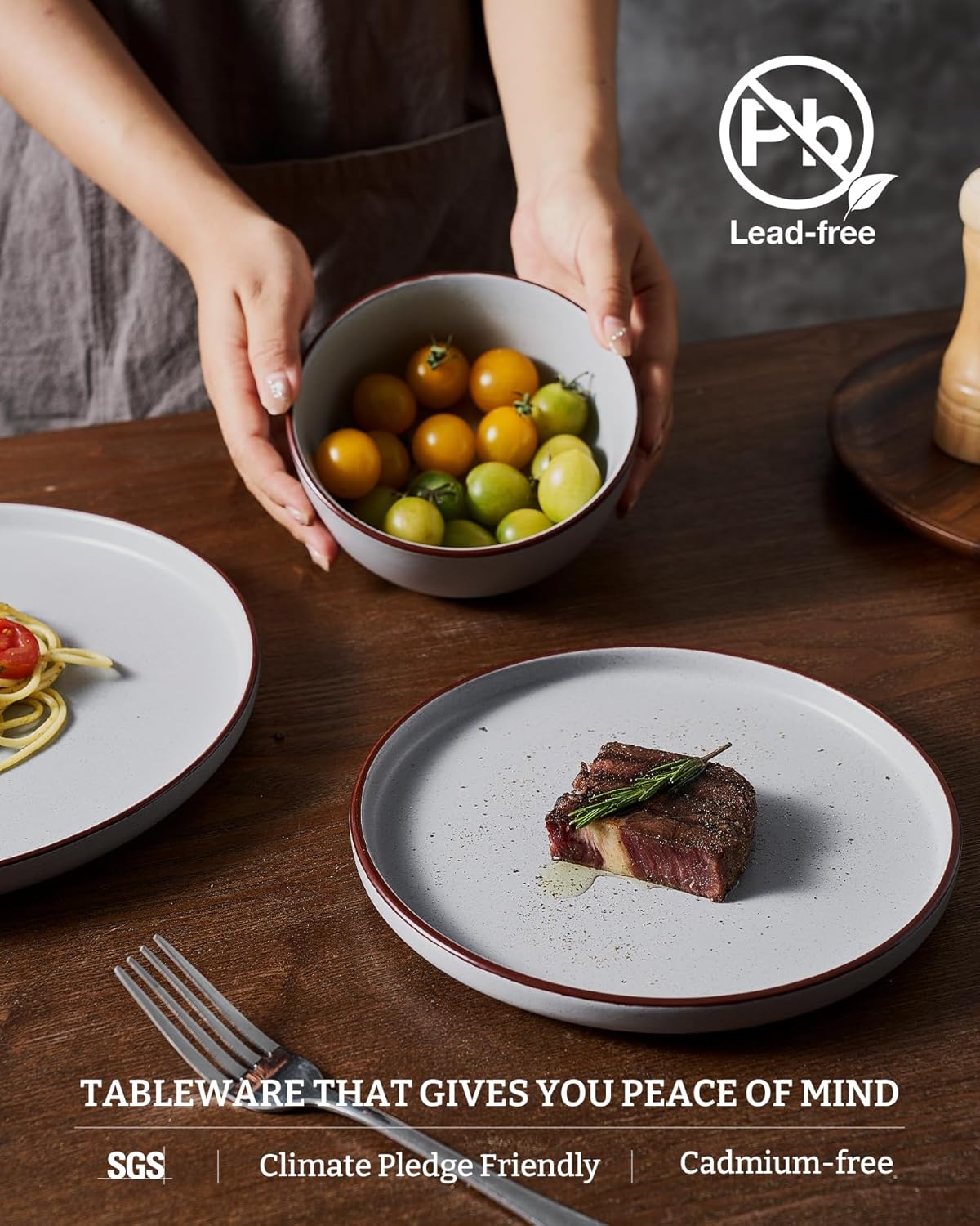 • 【FOOD GRADE NATURAL GLAZE】All of our dinnerware sets are made of food grade glaze. You can safely use them to serve steaks, salads or desserts, no need to worry about any harmful substances leaching into the food.