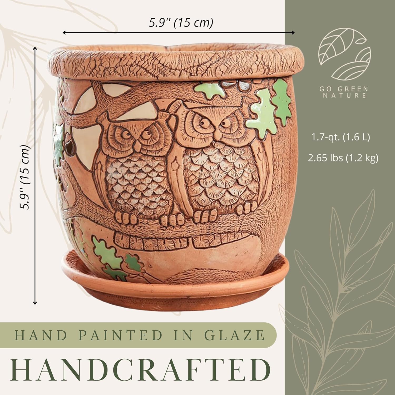 Ceramic Pot with Drainage Hole and Saucer, Plant Pots, Modern Decorative Planters for House Plants Indoor Flowers Plants, Cute Flower Pot - Gifts (Owls (1.6 L))