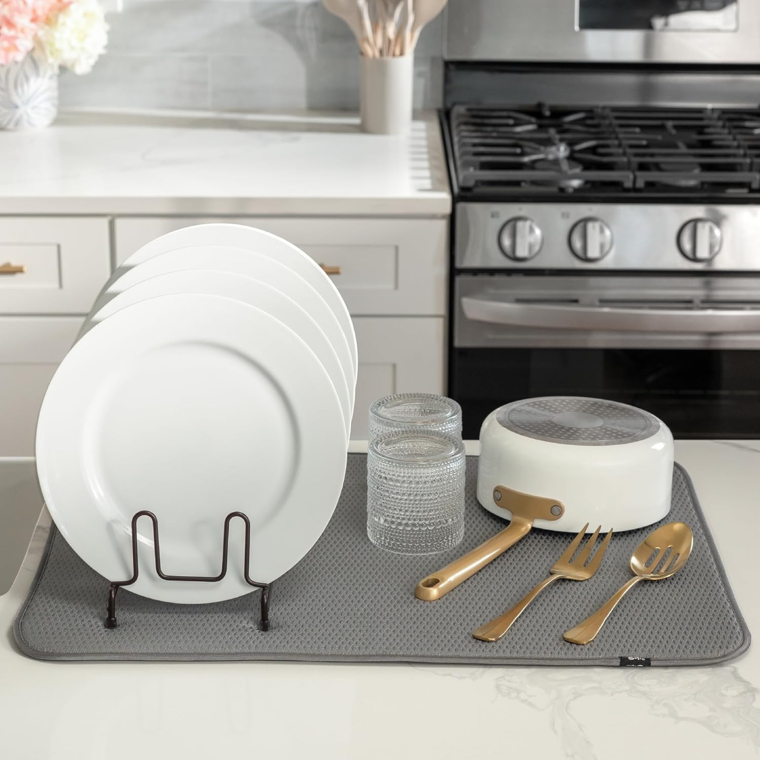 • Dish drying mats for kitchen counter are reusable, machine washable, and easy to store for kitchen organization; durable construction will not chip or break like a stone dish drying mat for kitchen