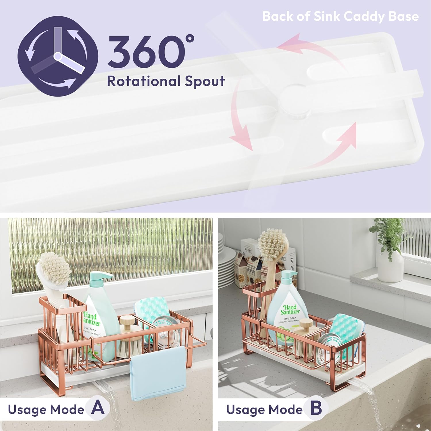 • [Automatic Draining]: Are you tired of cleaning the countertop?SWTYMIKI sponge holder for kitchen sink with 360° rotatable draining pipe can help you! Just put the sink caddy next to the sink, the water will drain automatically into the sink