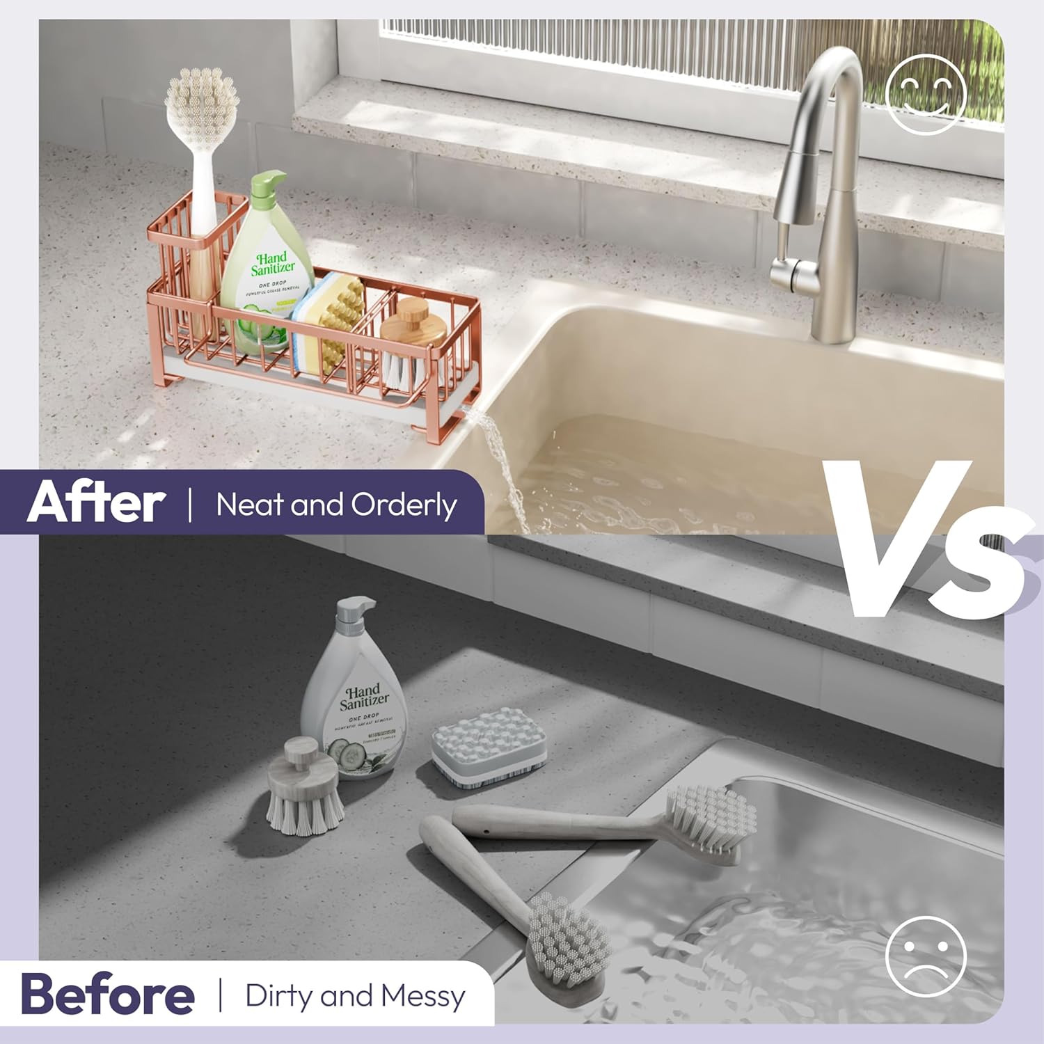 • [Large Storage Space Kitchen Essentials]: Our kitchen sink caddy organizer will give you a neat and clean kitchen for its strong storage capacity. Soap holder can hold three brushes, one rubber plug and a sponge, one bottle of soap dispenser-no swinging and no falling