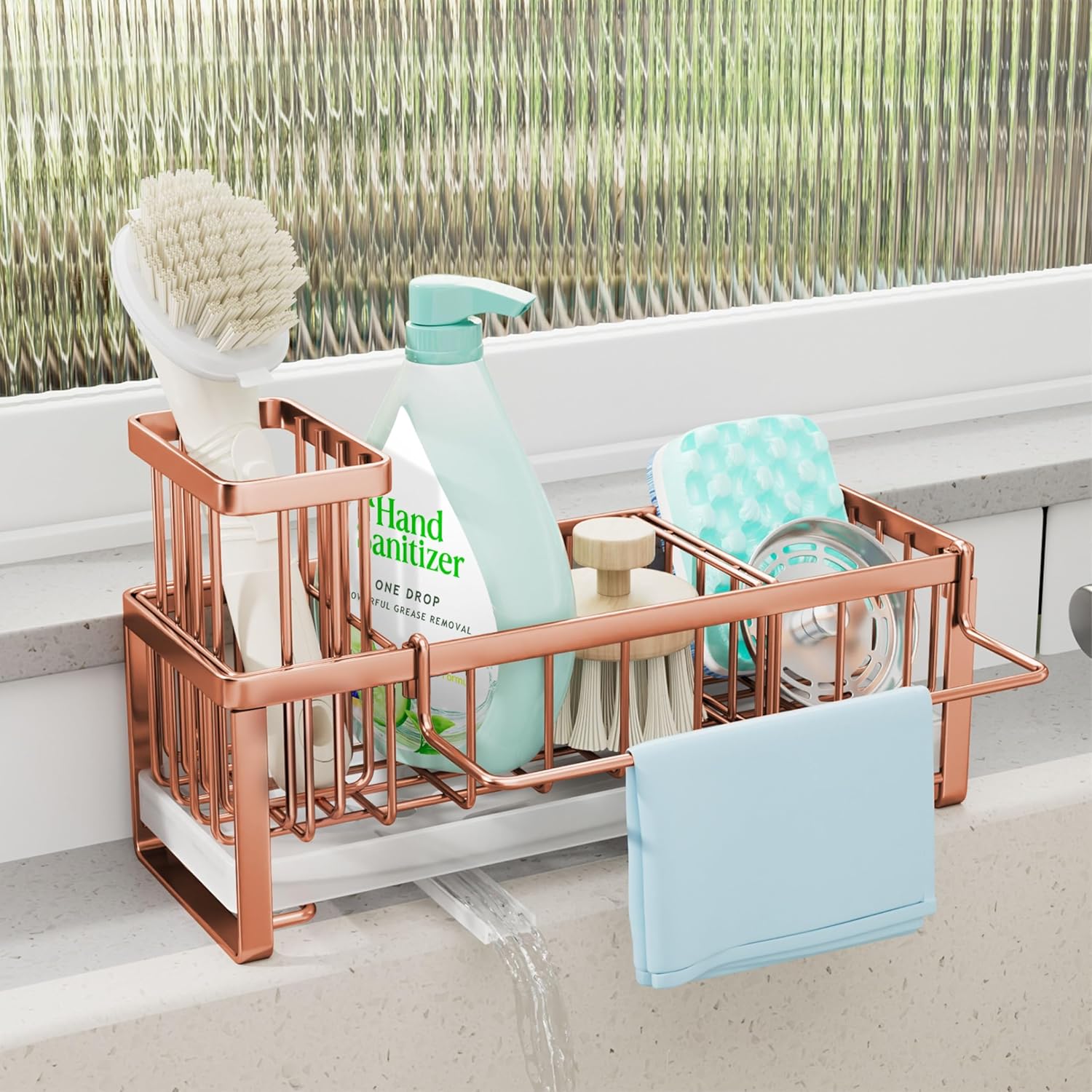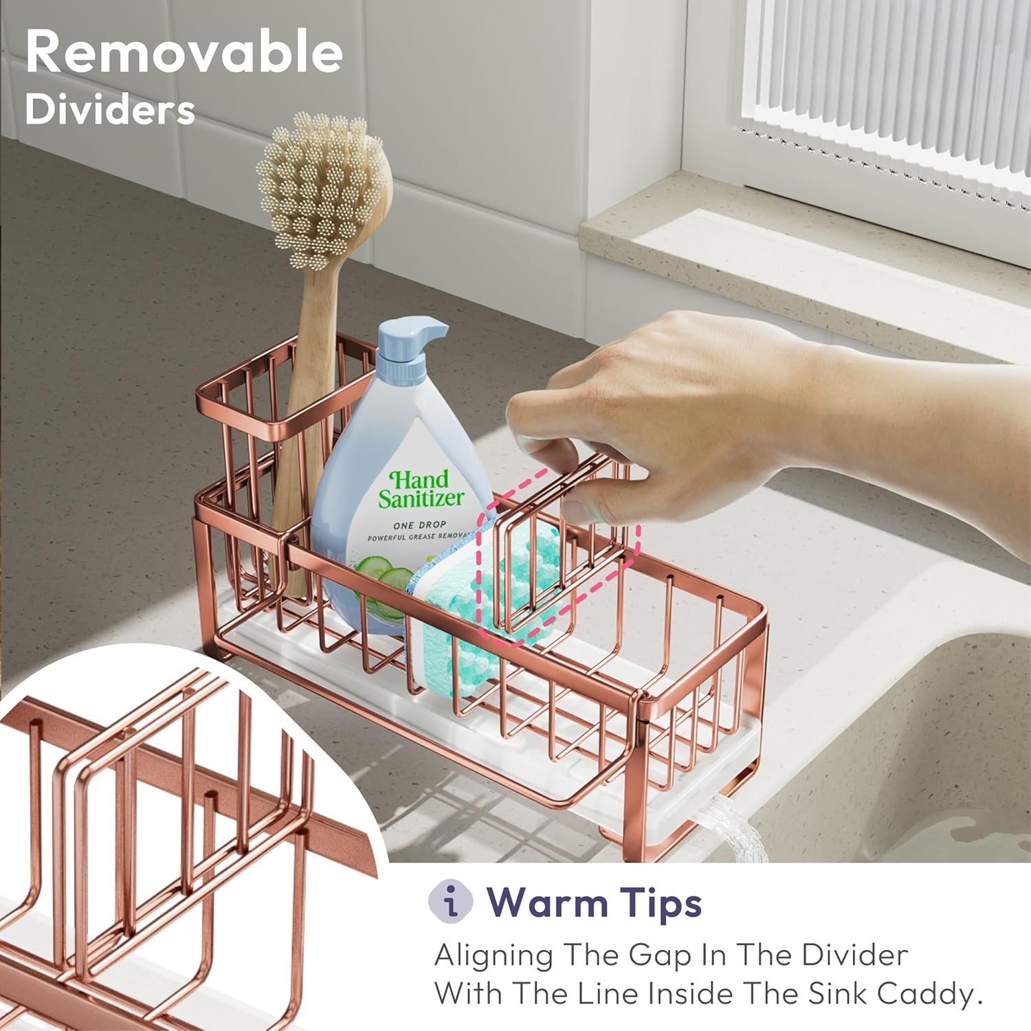 SWTYMIKI Sponge Holder for Kitchen Sink - Sink Caddy with Brush Holder Self-draining Sponge Caddy Organizer with Divider Stainless Steel Kitchen Accessories Storage for Countertop, Rose Gold