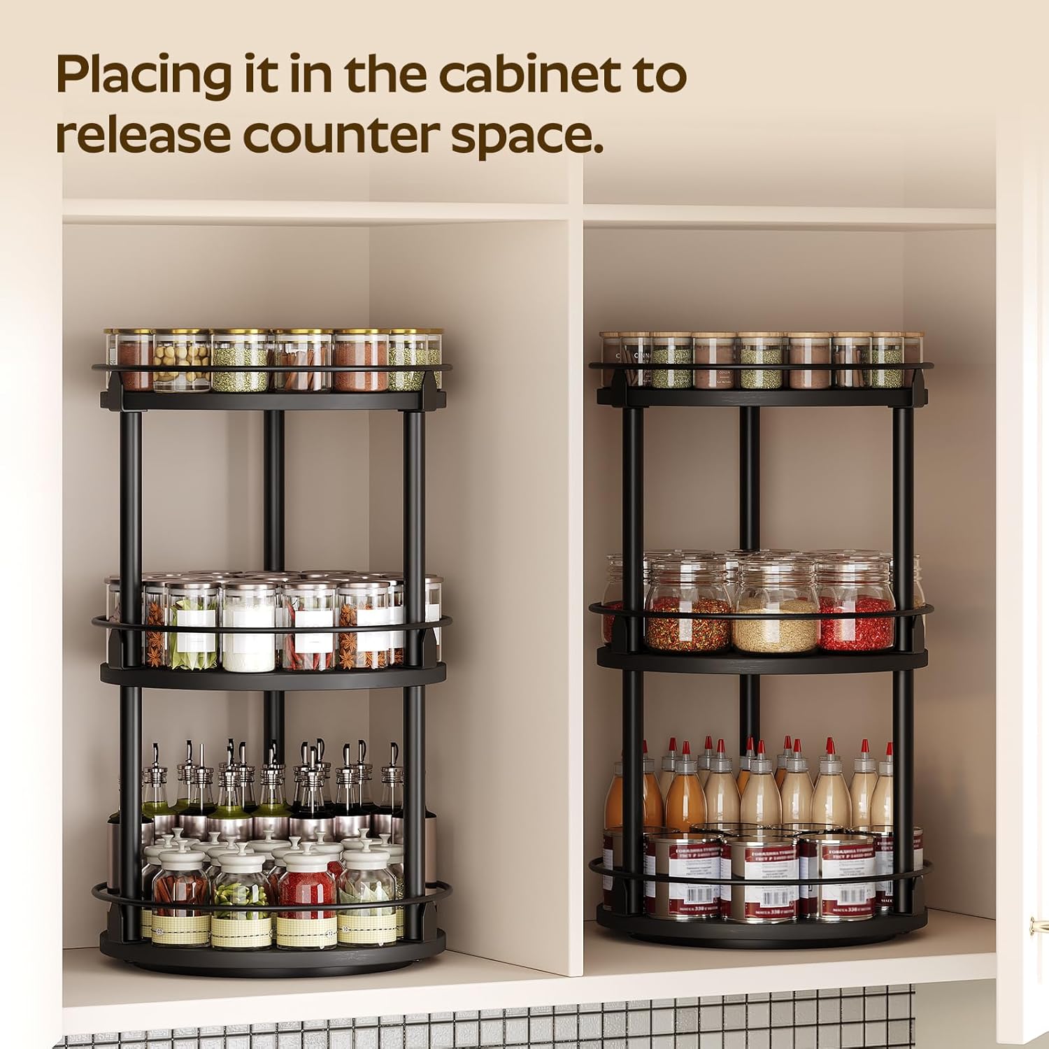• Capacious Space: Sizing 10.2"L x 10.2"W x 18"H, this lazy susan organizer is divided into 3 layers for layered and partitioned storage to help eliminate clutter. 7.5" layer spacing design facilitates accommodating bottles of different heights