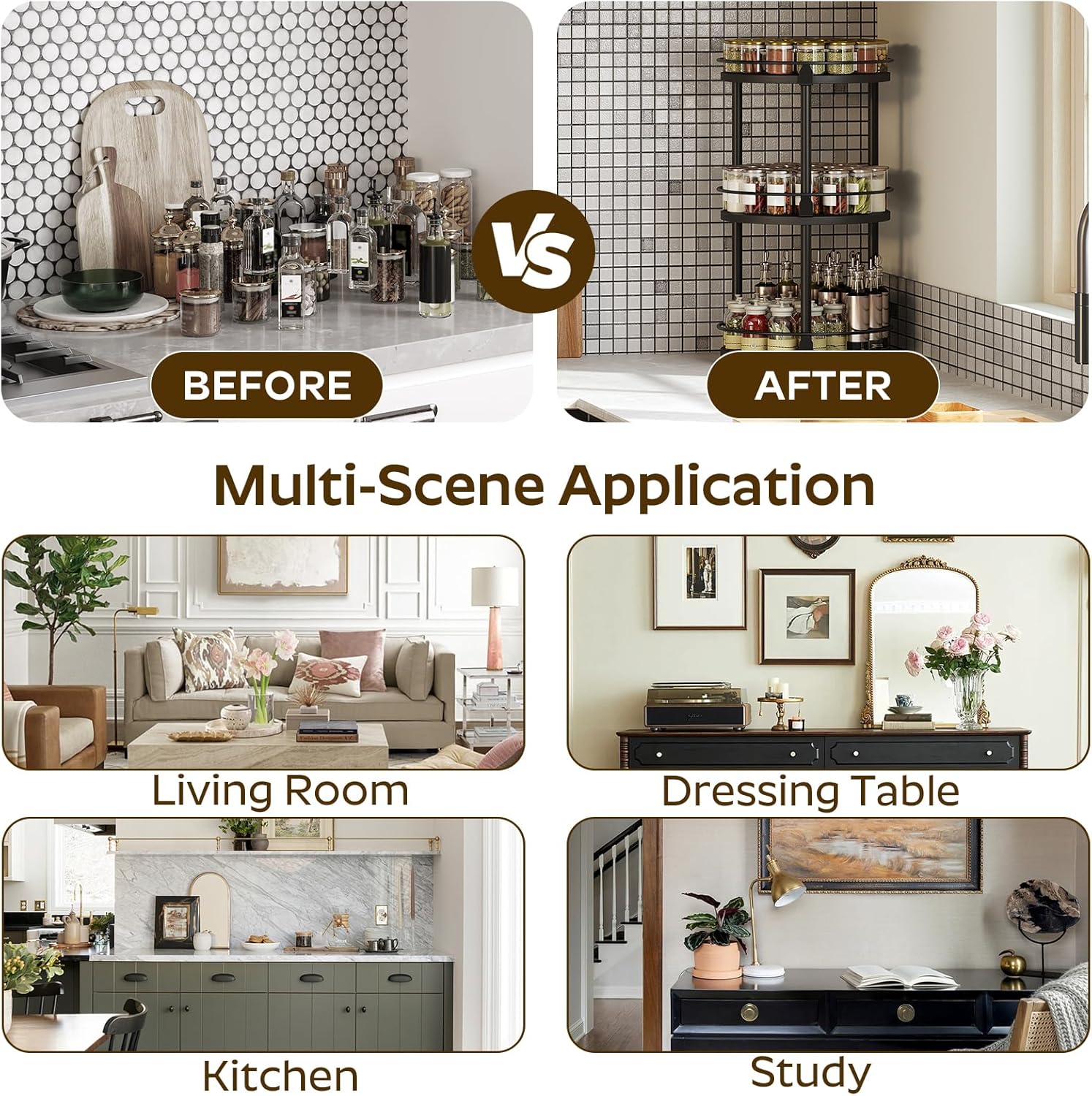 • Reduce Countertop Pressure: Place the lazy susan on the kitchen countertop to keep spice jars handy and the cooking area less messy. Use it on a dressing table to store your favorite cosmetics or on a dining table to easily locate your preferred spices