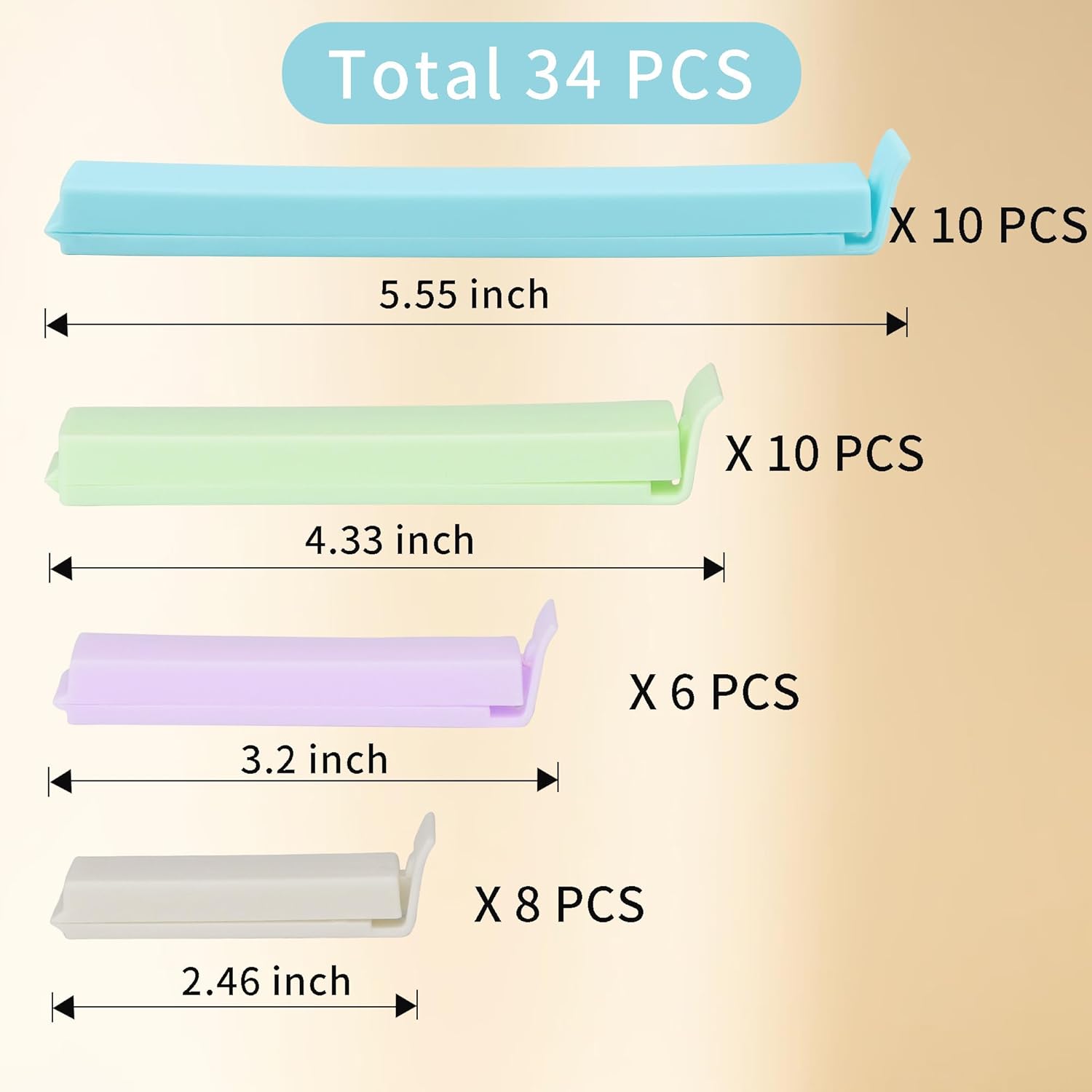 34 Packs Plastic Chip Clips for Food Storage - Resealable Sealing Clips in 4 Sizes (2.4"/3.2"/4.3"/5.5") - Light Colors
