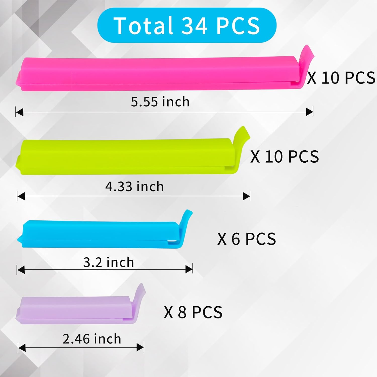 34 Pack Plastic Chip Clips - Resealable Sealing Clips for Food Storage & Snack Bags - 4 Sizes, Bright Colors - 2.4"/3.2"/4.3"/5.5"