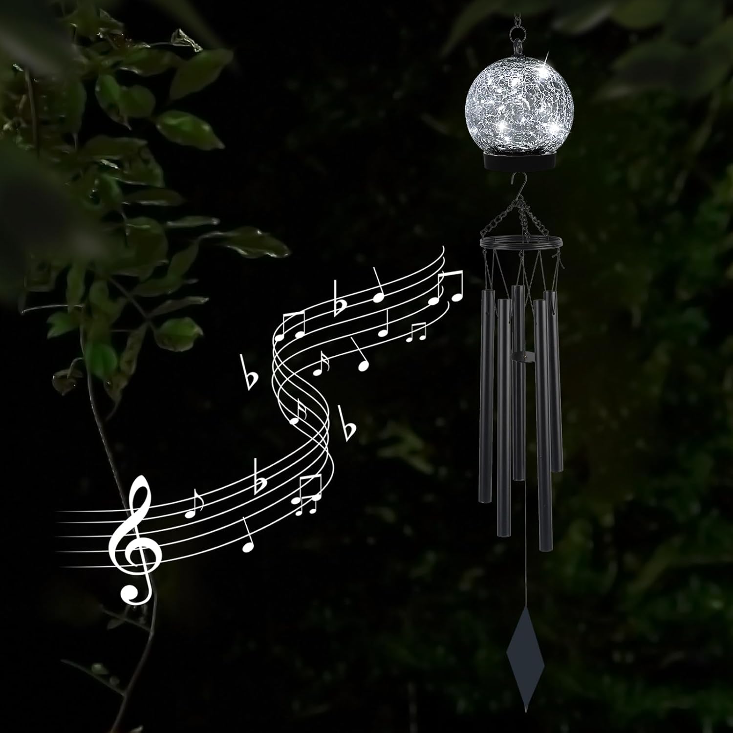 • 【Pretty Garden Décor】: The unique solar wind chimes are designed to add a refreshing and stylish touch to your outdoor. The hanging cracked glass lantern is like a beautiful crystal ball, providing cool white light and a romantic atmosphere for your yard. It is not only a hanging wind chime for outside but also a solar garden light decor.