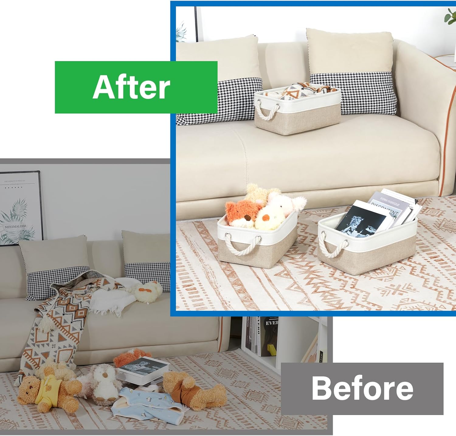 • Set of 3 Small Storage Baskets: The size of each fabric storage basket is 11.8 x 7.8 x 5 inches. Each Canvas storage bins are very light to transport items with less effort. Perfectly fit for most cube organizers, shelves closets or change tables. Sturdy and soft fabric baskets for home storage with good abrasion resistance