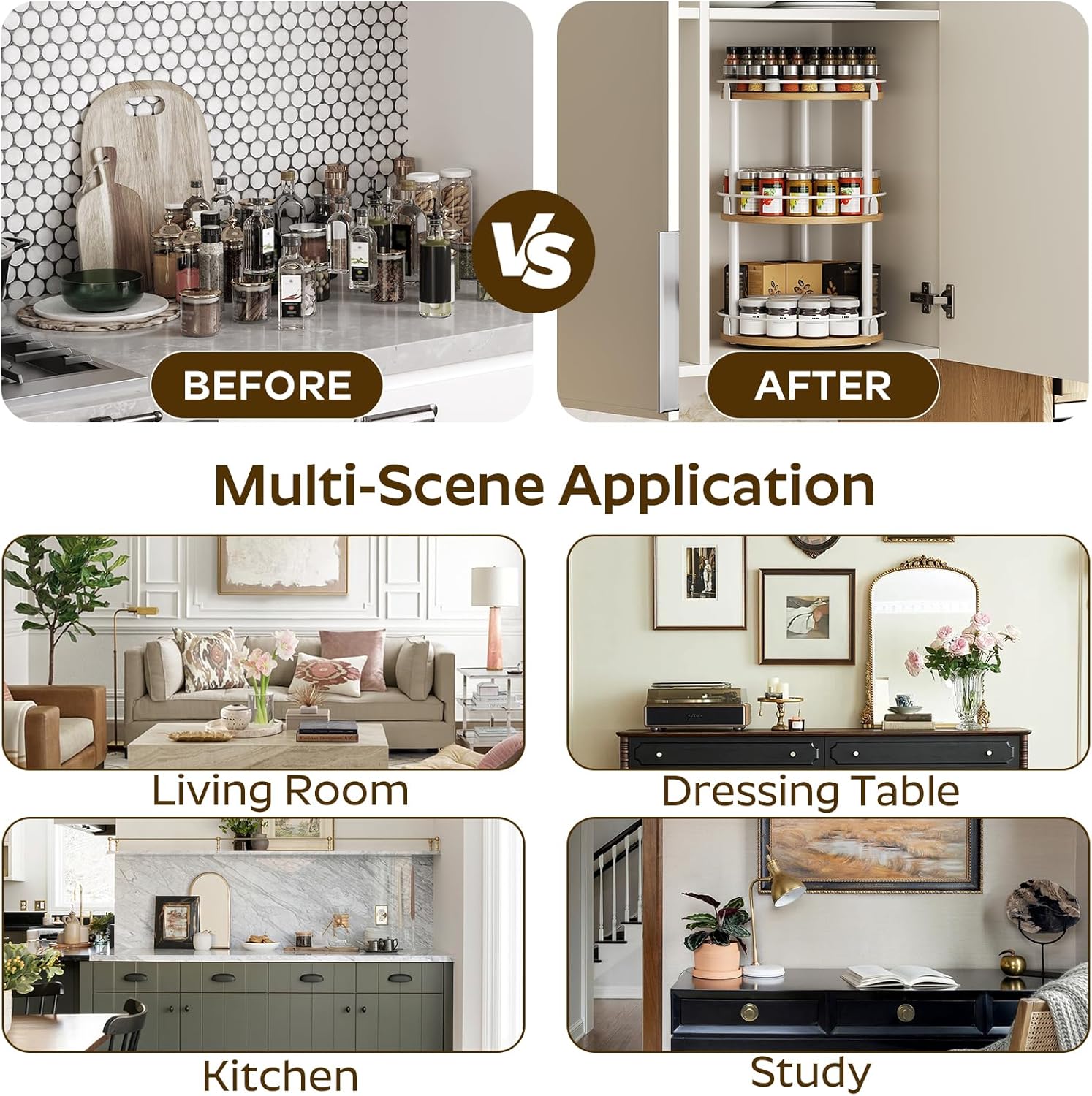 • Reduce Countertop Pressure: It is multifunctional. On the kitchen countertop, it keeps spice jars close at hand to make cooking fun. On the vanity table, it holds your beloved pieces. At the dinner table, you can easily "spin" to get your favorite