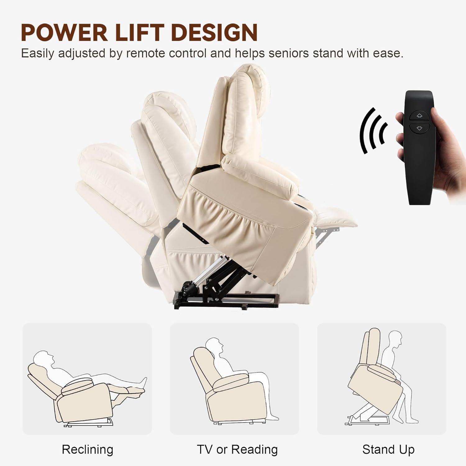 SALOHZA Power Lift Recliner Chair for Elderly with Massage and Heat for Living Room, Electric Recliner Chair for Adults with USB/Type C Port/Cup Holders, PU Faux Leather, Cream White