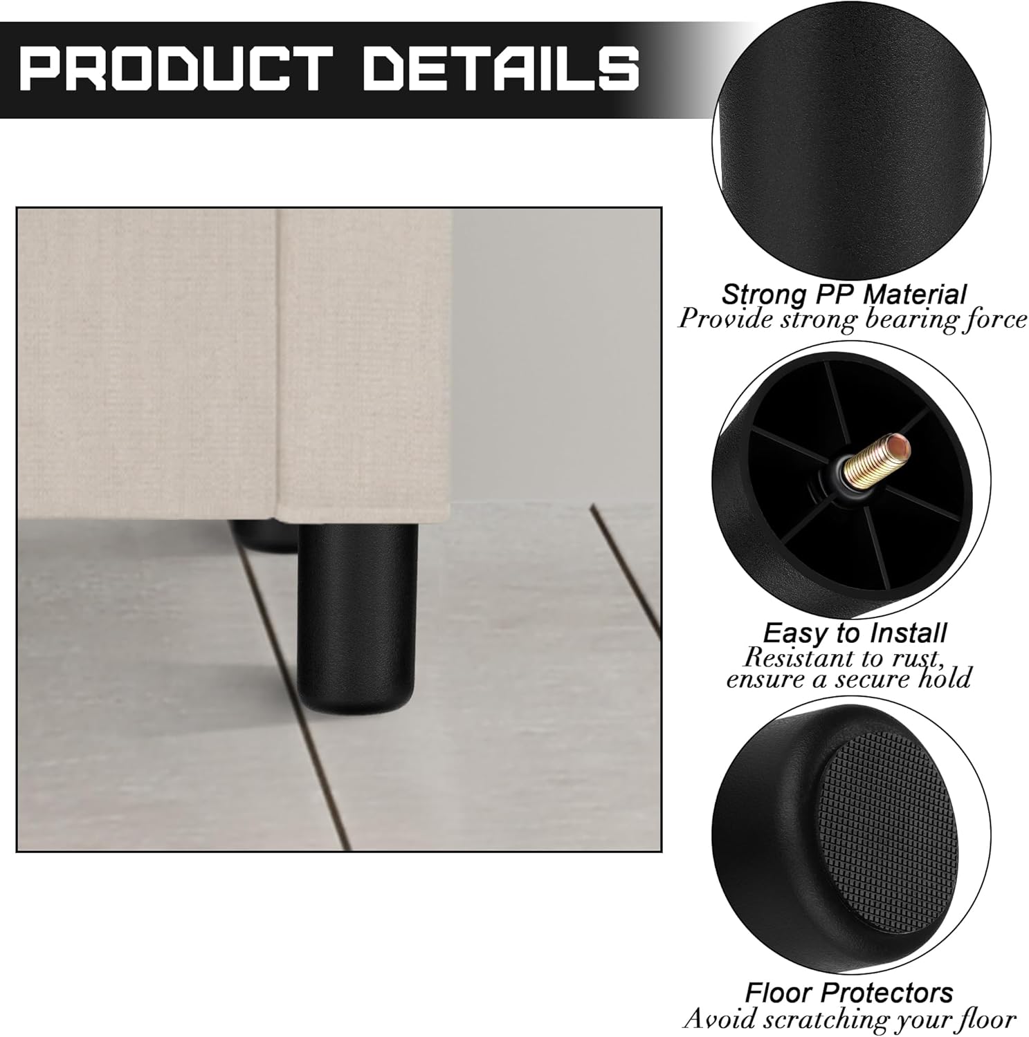 • Advantages: these replacement furniture legs with strong bearing force can help lift your furniture immediately, make you efficiently clean the place under furniture, and provide storage space for your furniture; all accessories are complete, so you can upgrade your furniture within seconds; each sofa leg is equipped with elastic rubber covers, providing additional protection and anti-slip function