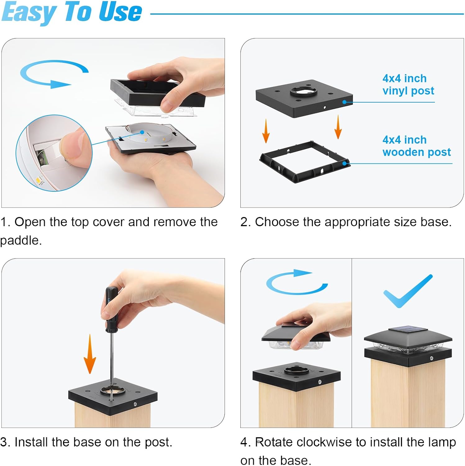• 【Easy Installation】Each package contains 2 bases (4x4 wooden post and 4x4 vinyl post) and 12 screws. Choose the appropriate base size and place it on the corresponding post, then screw the two screws into the post through the small holes on both sides of the base. The solar fence post cap light is charged in sunlight for 6-8 hours during the day and automatically turns on for 10-12 hours at night
