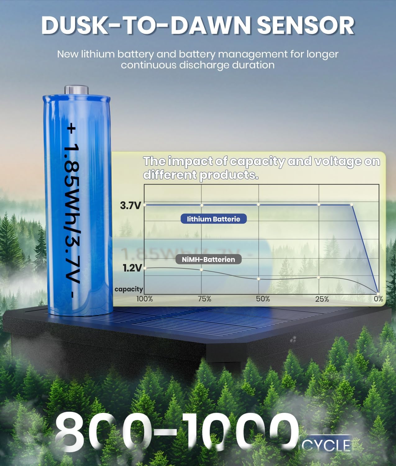 • 💡【2025 Upgraded Solar Panel & LONG-LASTING Lighting】Solar pathway lights outdoor are equipped with 5V monocrystalline silicon solar panels with 26% higher conversion rate, 800 mAh rechargeable Ni-MH battery.The solar powered landscape lights can illuminate for 10 -12 hours on a 4-6 hour sun day charging. Compared with other solar lights outdoor waterproof, our solar lights outdoor charge faster and work longer.