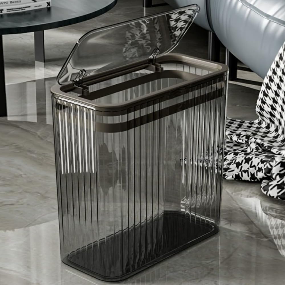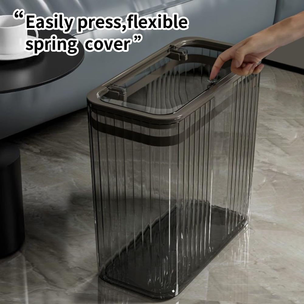 • 【Narrow Design】Size: 12.52*5.90*11.61 inches. The transparent garbage can with narrow design is suitable for any room in your home, especially for the corner, and it won’t take up much space.