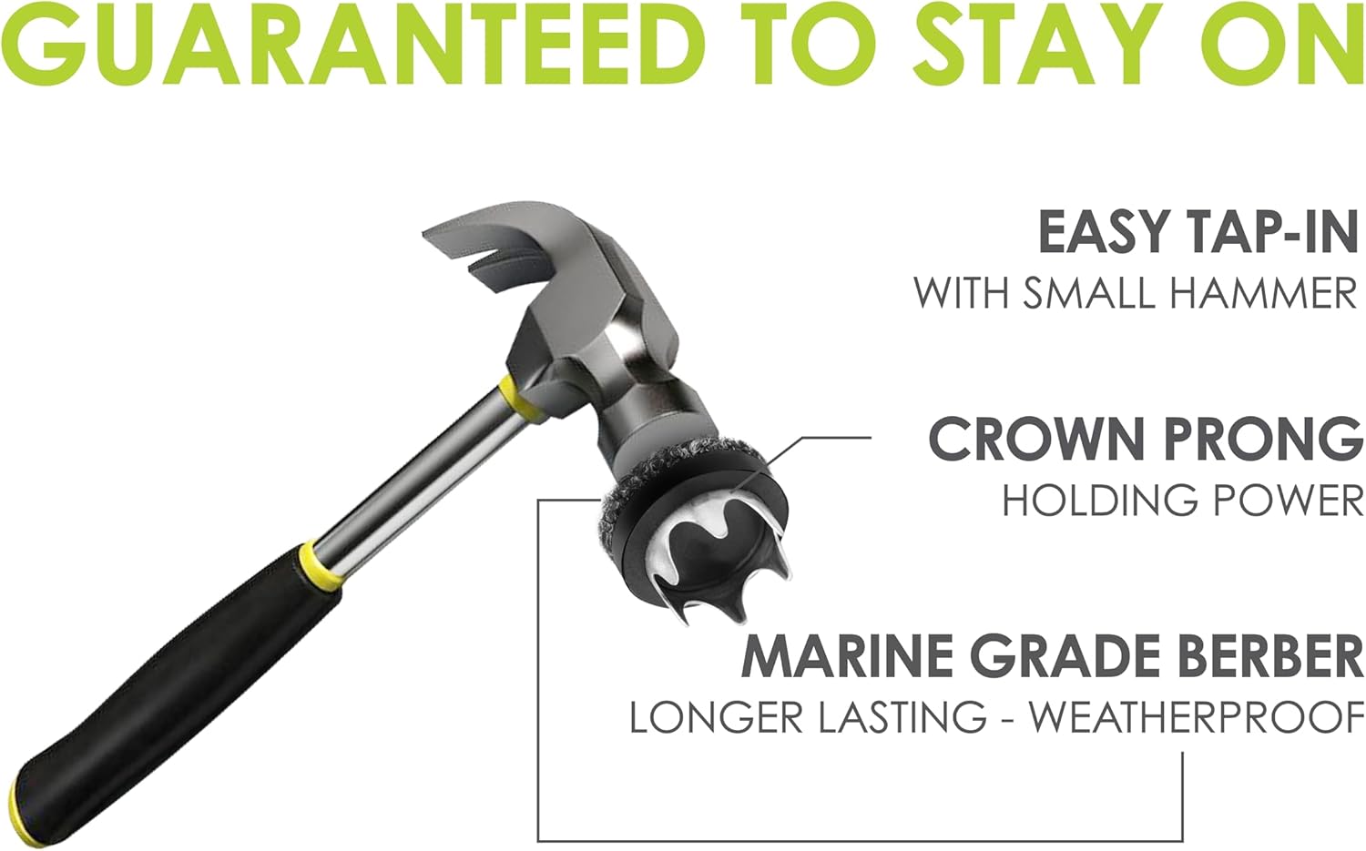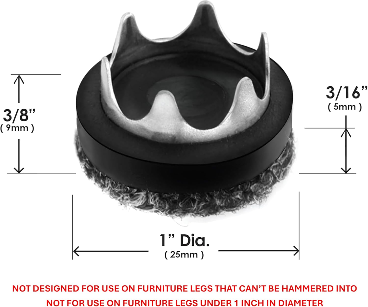 • Weatherproof & guaranteed to stay on furniture – Each tap in berber furniture glide features 6 steel prongs that hangs on and won’t come off chair feet / furniture legs that are outdoors or indoors. Not for use on furniture legs under 1" diameter at base or furniture legs that can’t be hammered into.