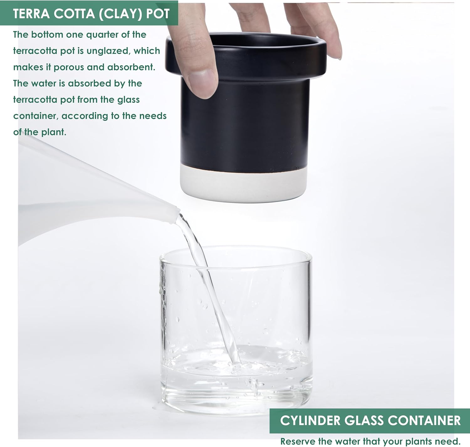 • Self-Watering System: The bottom quarter of the terracotta pot is unglazed, with a glass reservoir that allows plants to absorb just the right amount of water through the pot walls.