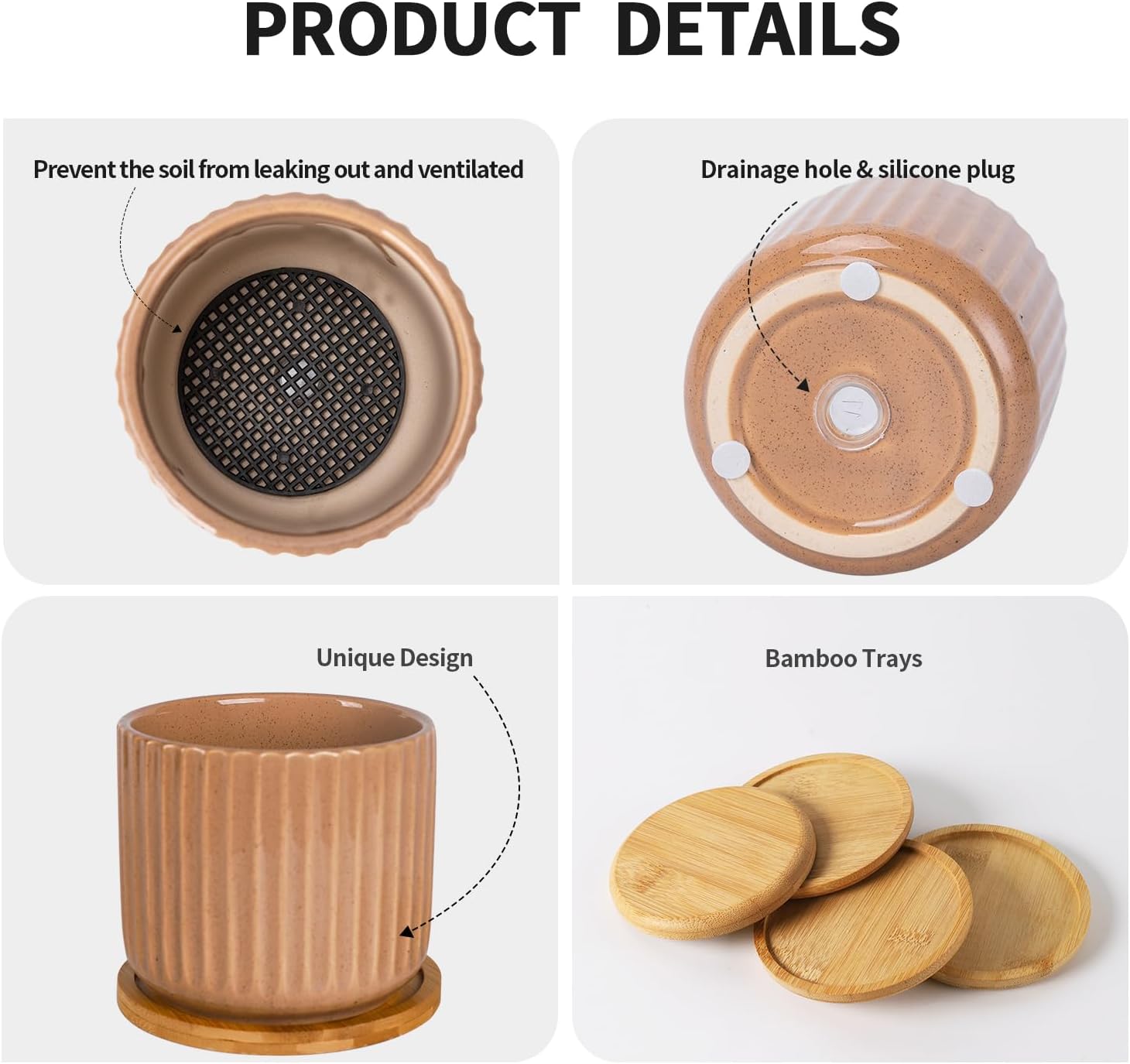 • Drainage Hole / Plug and Mesh Pad - With a drainage hole,allow execs water to drain away in time.which can make your plants breath more freely. Mesh pad keep soil from migrating out of the pot drain, and keeping the hole unblocked for a long time. You also could use the pot with the plug if you don't need the drain.
