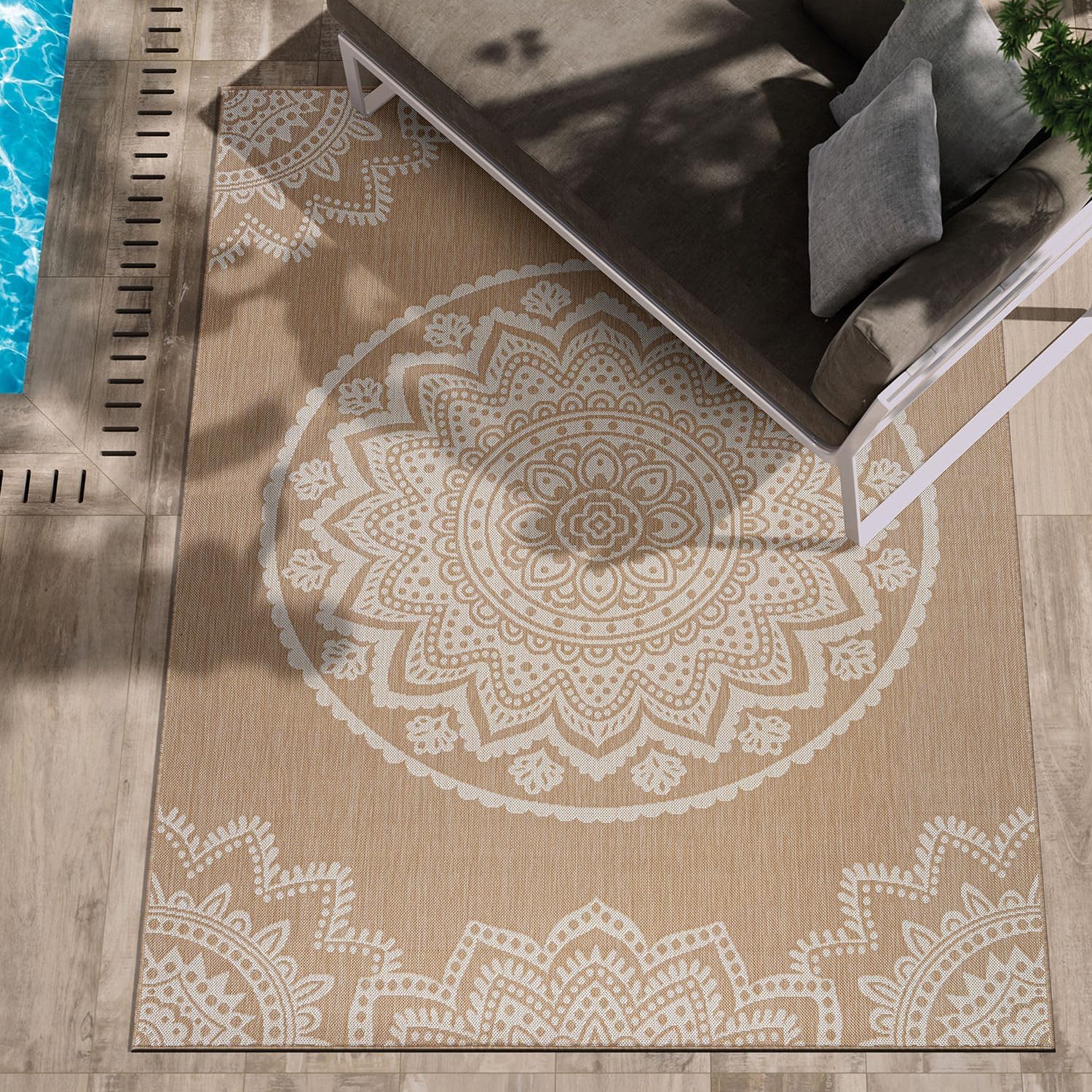 CAMILSON Outdoor Rug 9x12 Modern Area Rugs for Large Indoor and Outdoor Patios and Porches - Waterproof Washable Non-Shedding Easy-to-Clean Outside Carpet (9 x 12, Medallion - Beige/White)