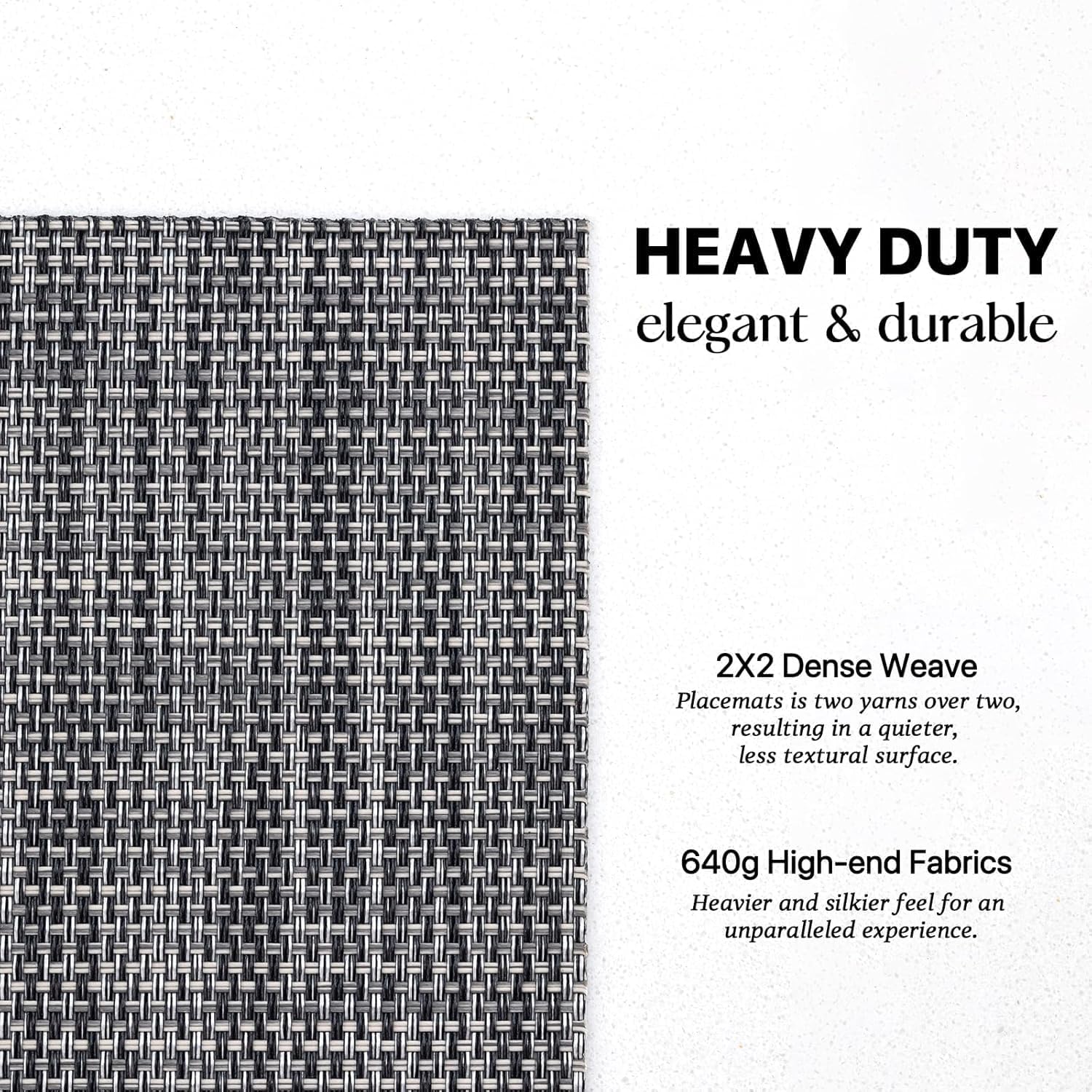 • HEAVY-DUTY:We uses the German-imported higher grammage vinyl material (Specialty PVC)than other placemats on the market,plus the precise,dense weave craftsmanship to give the woven placemats a thicker feel and make the place mats long-lasting.