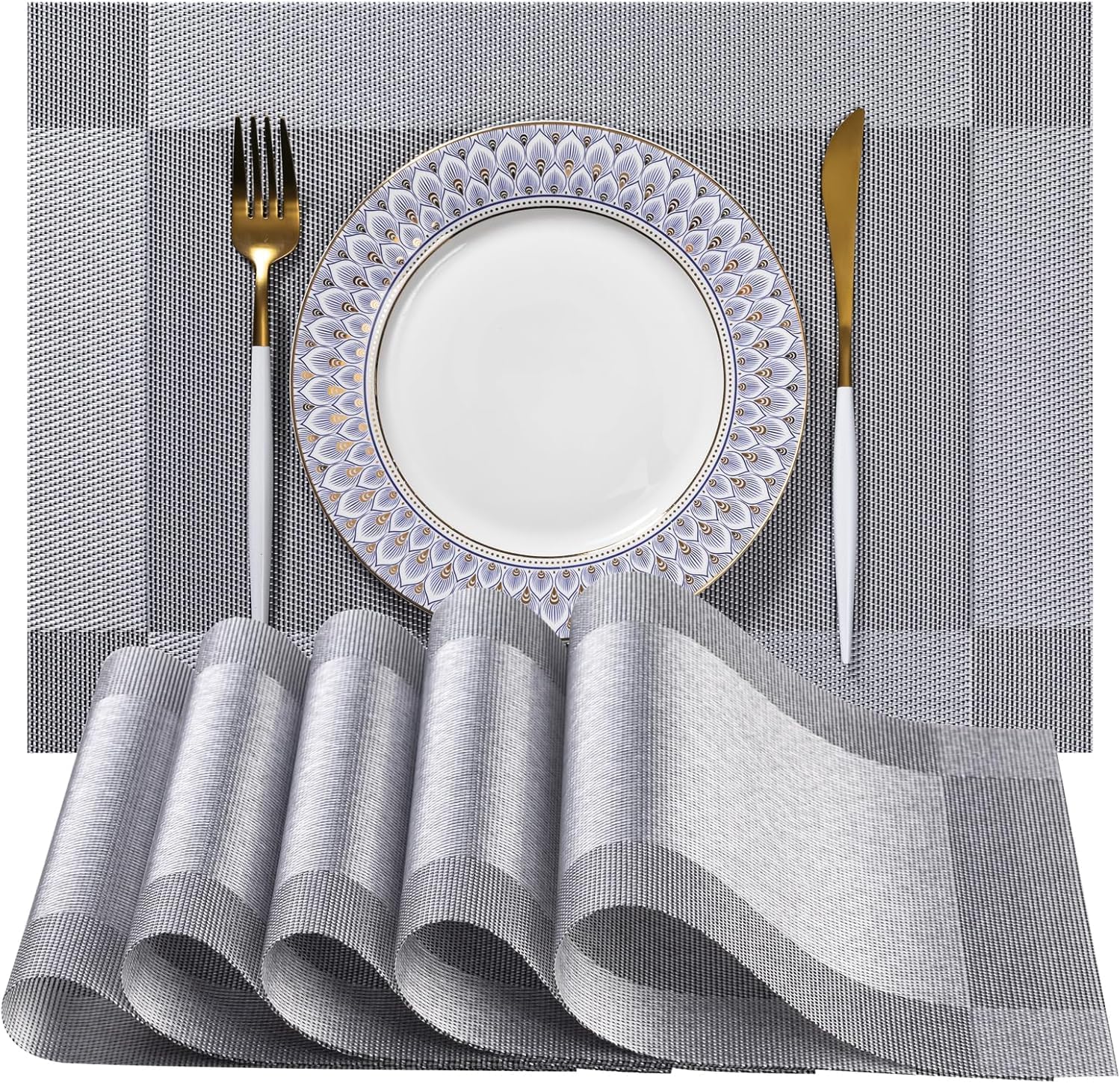 LEXMORE Placemats Set of 12 Vinyl/Plastic Woven Place Mats for Kitchen Table Indoor/Outdoor Washable Placemat Wipeable Dining Table Mats(G-Silver Cube)