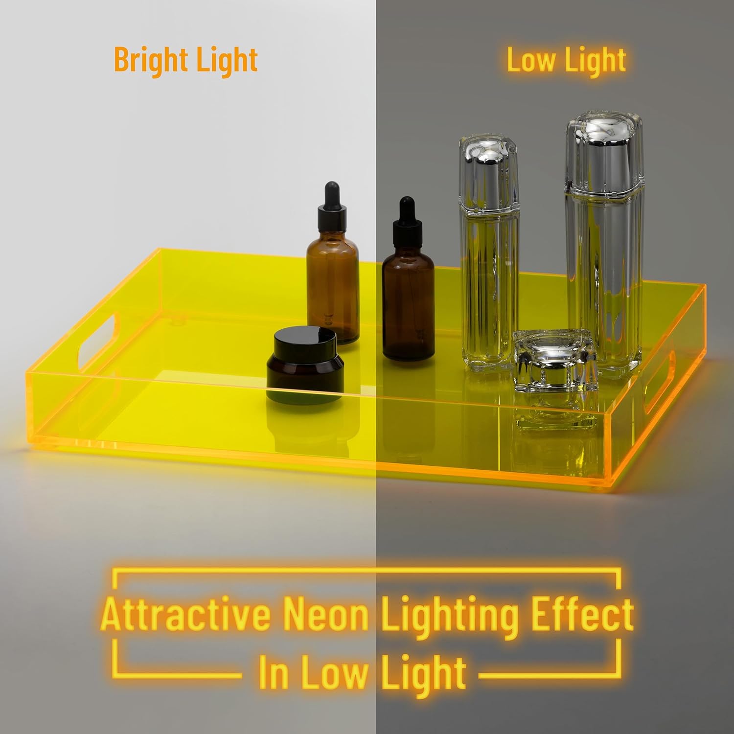 Large Acrylic Serving Tray Decorative Ottoman Coffee Table Vanity Tray Tea Fruit Platter Snack Appetizer Dessert Drink with Handles for Bar Kitchen Party, Neon Yellow