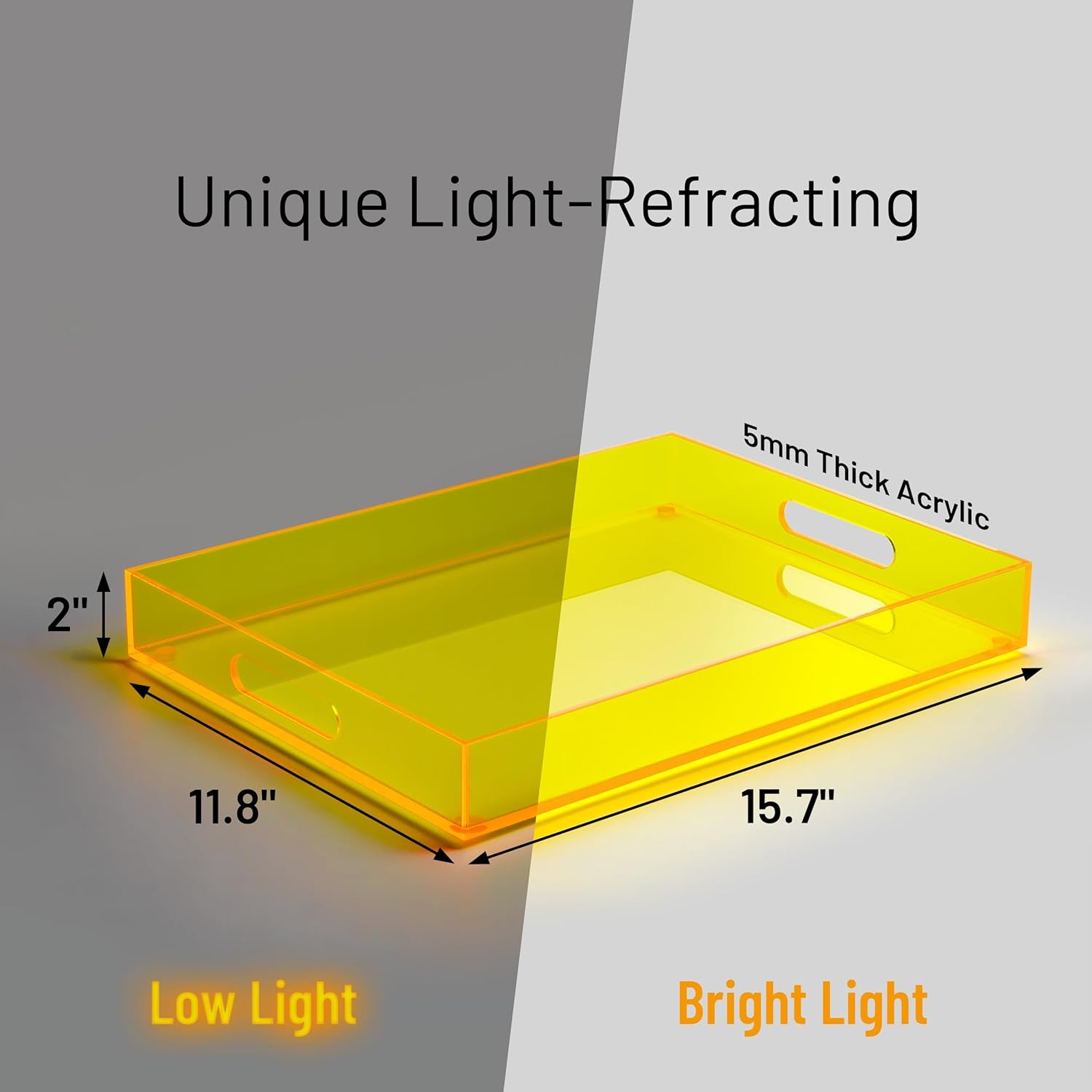 • EYE-CATCHING ACRYLIC: Our serving tray is crafted from high-grade 5mm acrylic of varying translucent colors, known for its durability and unique light-refracting qualities. The tray's bright and vibrant colors easily catch your eye, making it a wonderful decor piece that shines under both indoor and outdoor lighting, creating a mesmerizing visual effect that enhances its appeal.