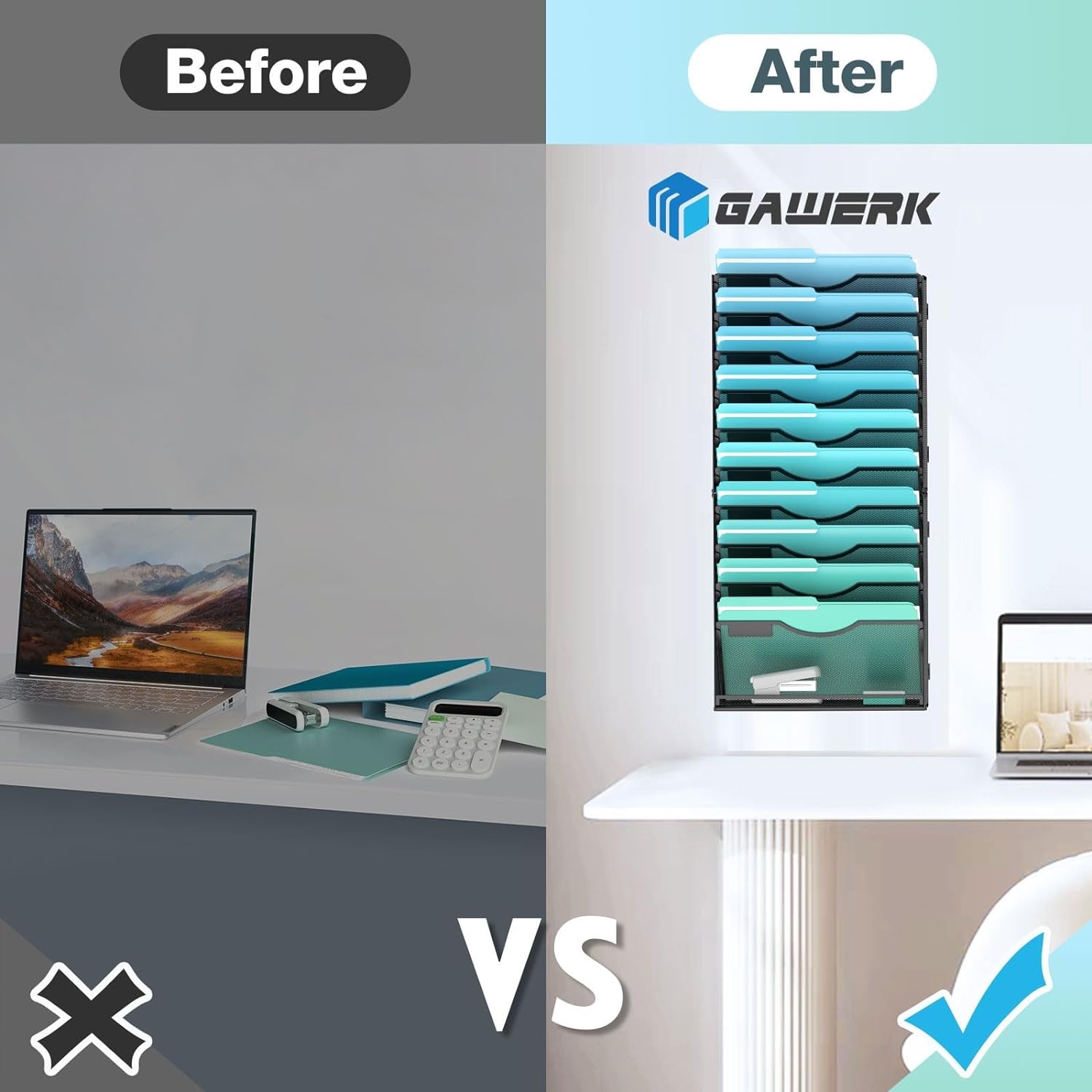 • Sturdy Metal Structure - Gawerk hanging paper organizer is made of high-quality metal materials. This magazine rack wall mounted has a powder coating, oxidation resistance and rust prevention, effectively prolonging its service life.