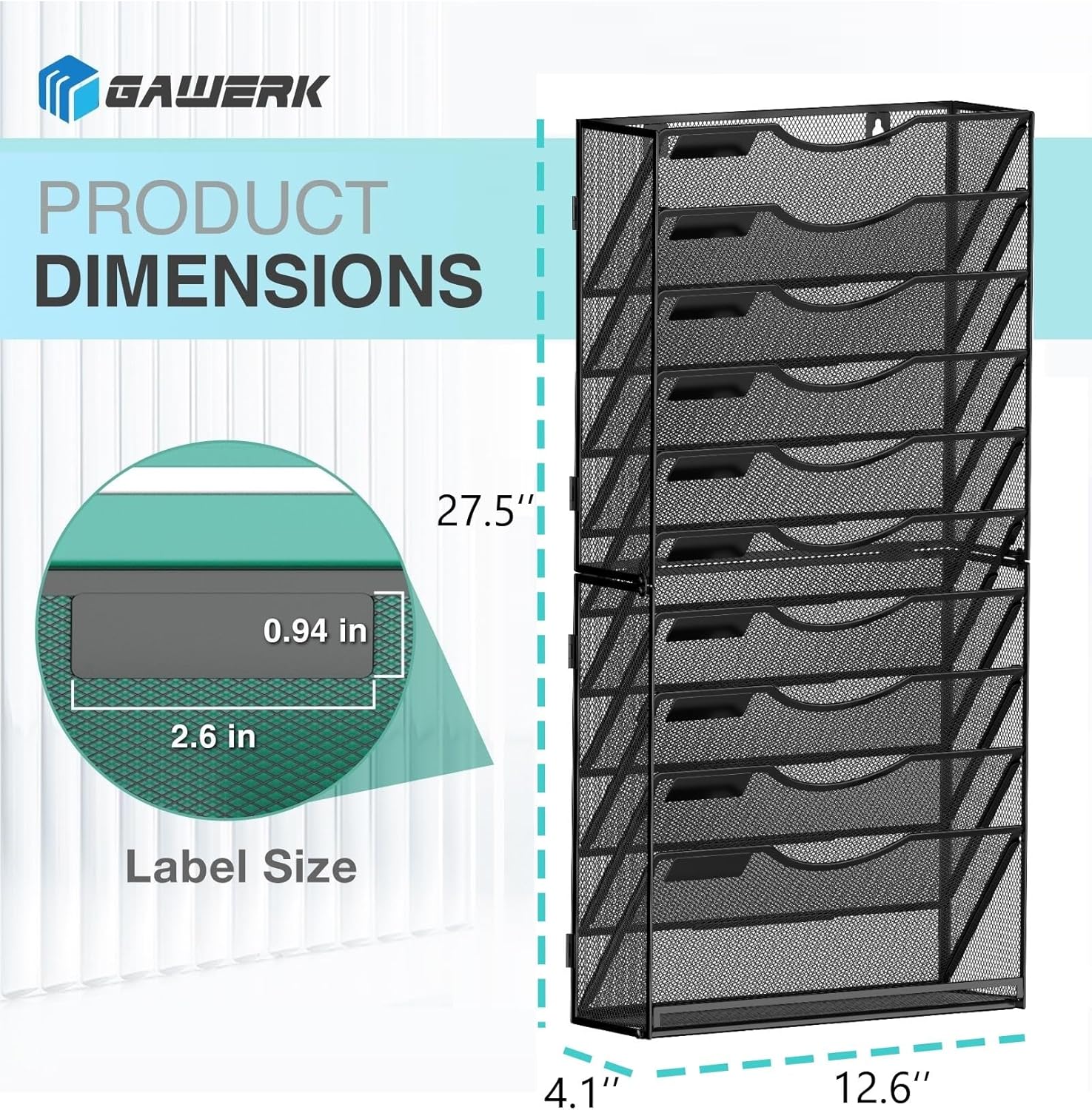 11-Tier Wall File Organizer Hanging Wall File Holder Wall Mount Paper Folder Organize, Mesh Magazine Document Mail Organizer Wall Organizer for Office School Home, Black