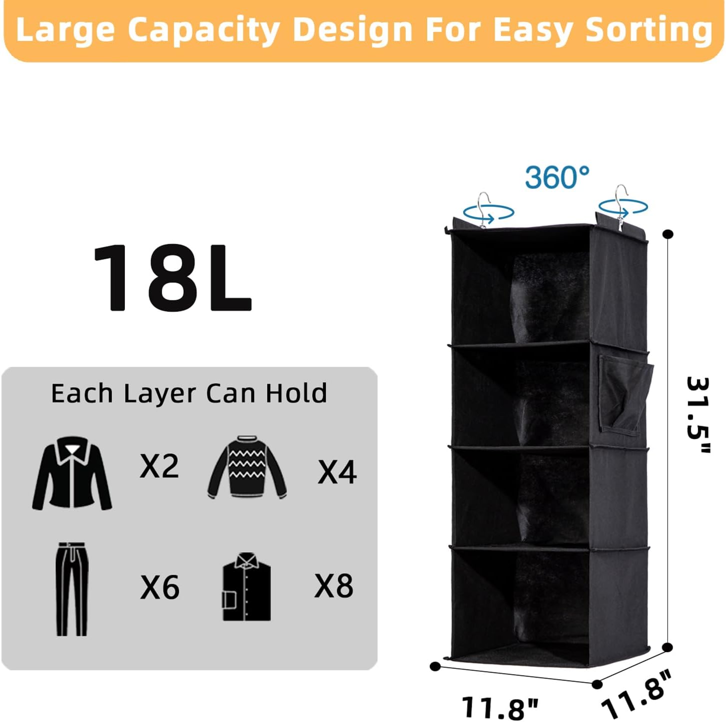 • 【Product Dimensions】This overall size is 11.8"(L)*11.8"(W)*31.5"(H). Each unit is 11.8"(L)*11.8"(W)*7.87"(H) . Before buying, it is recommended to measure the distance between your closet rod and the floor to see which model would be best for you.