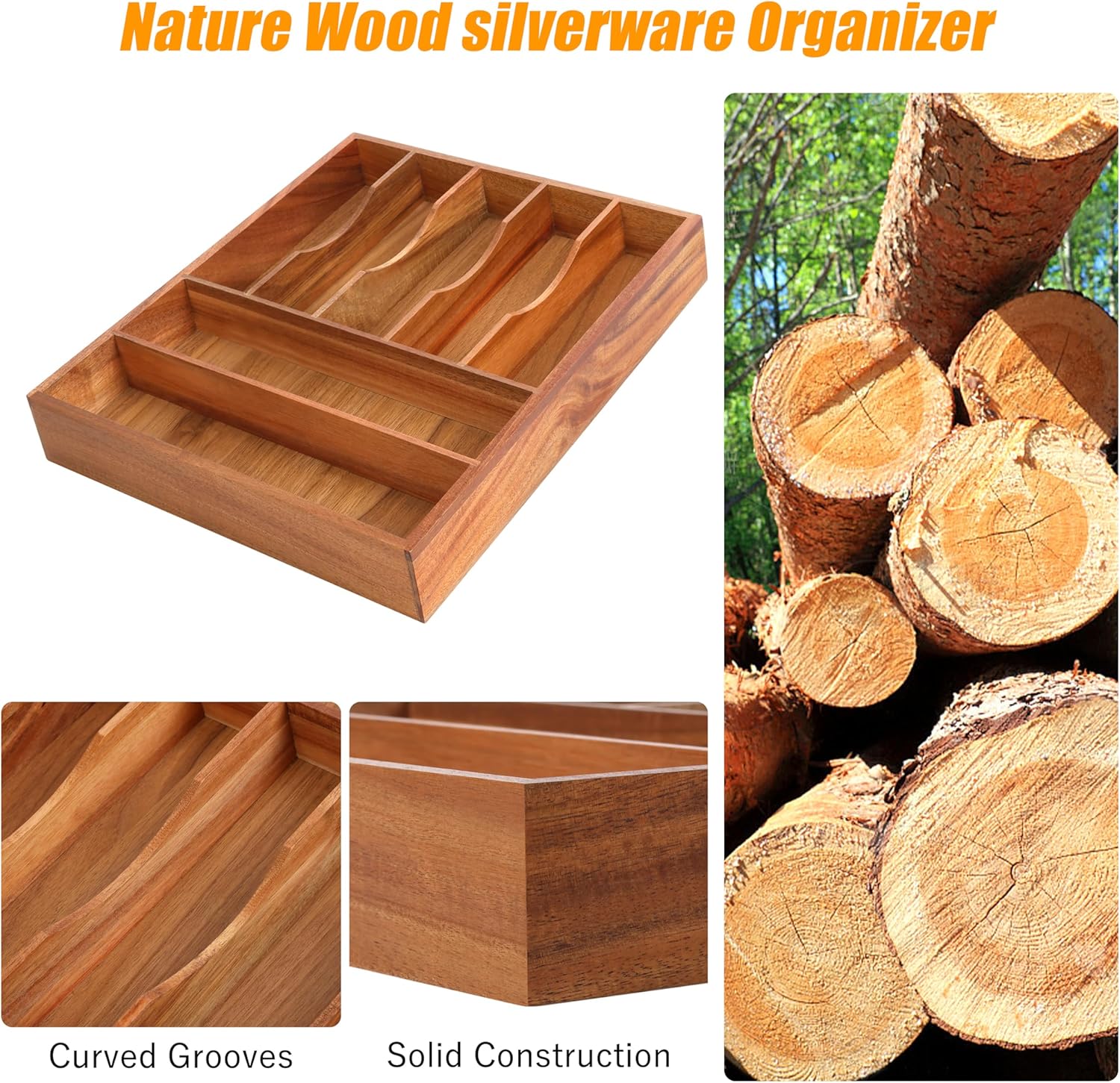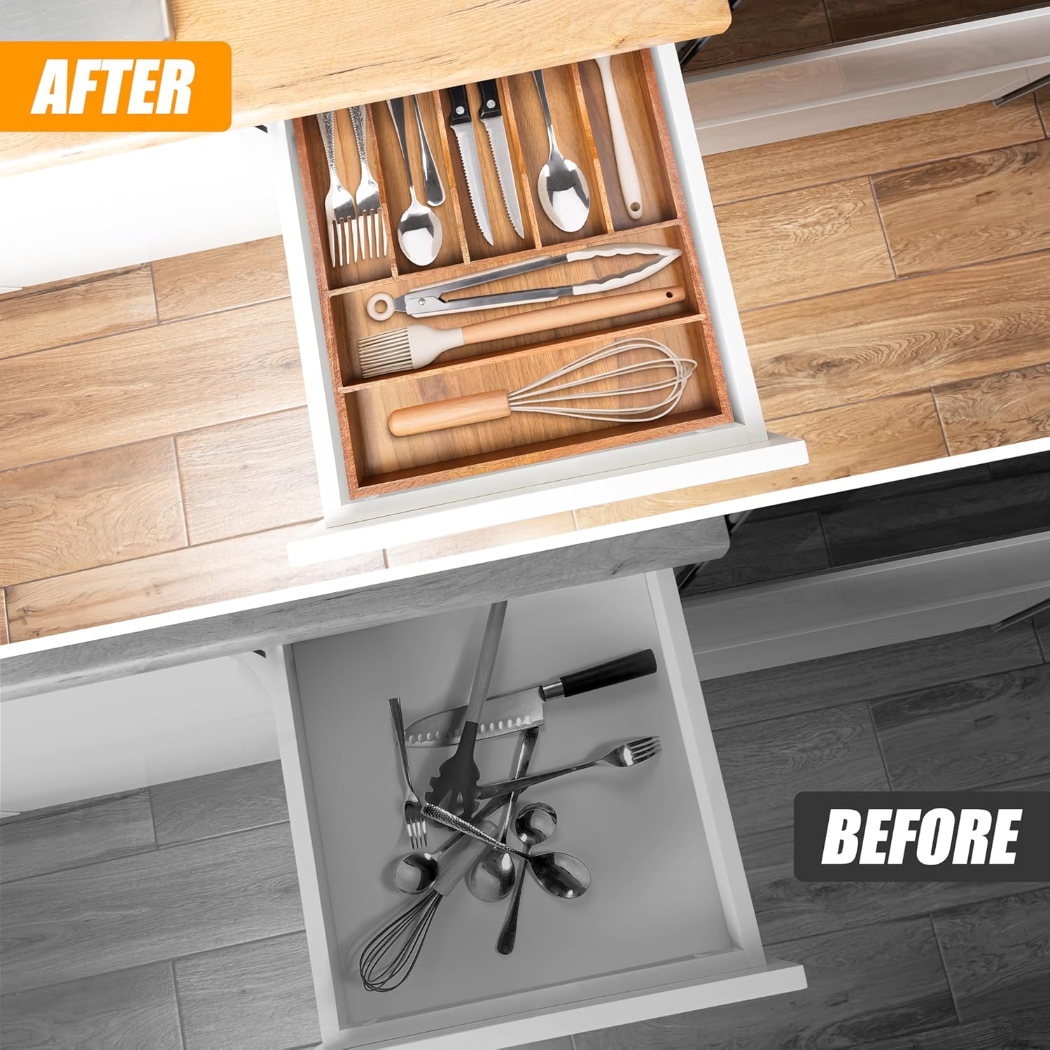 • ✅【Perfect premium bamboo】Our utensil silverware drawer organizer flatware cutlery tray is crafted from natural bamboo that has been grown for over 4 years. Each silverware drawer organizer made of bamboo is meticulously handcrafted by seasoned artisans to ensure a smooth, splinter-free surface. You can confidently allow your family or children to use our silverware drawer organizer. Unlike plastic and metal drawer organizers, our utensil holder is water-resistant and odor-resistant, making it perfect for long-term use.