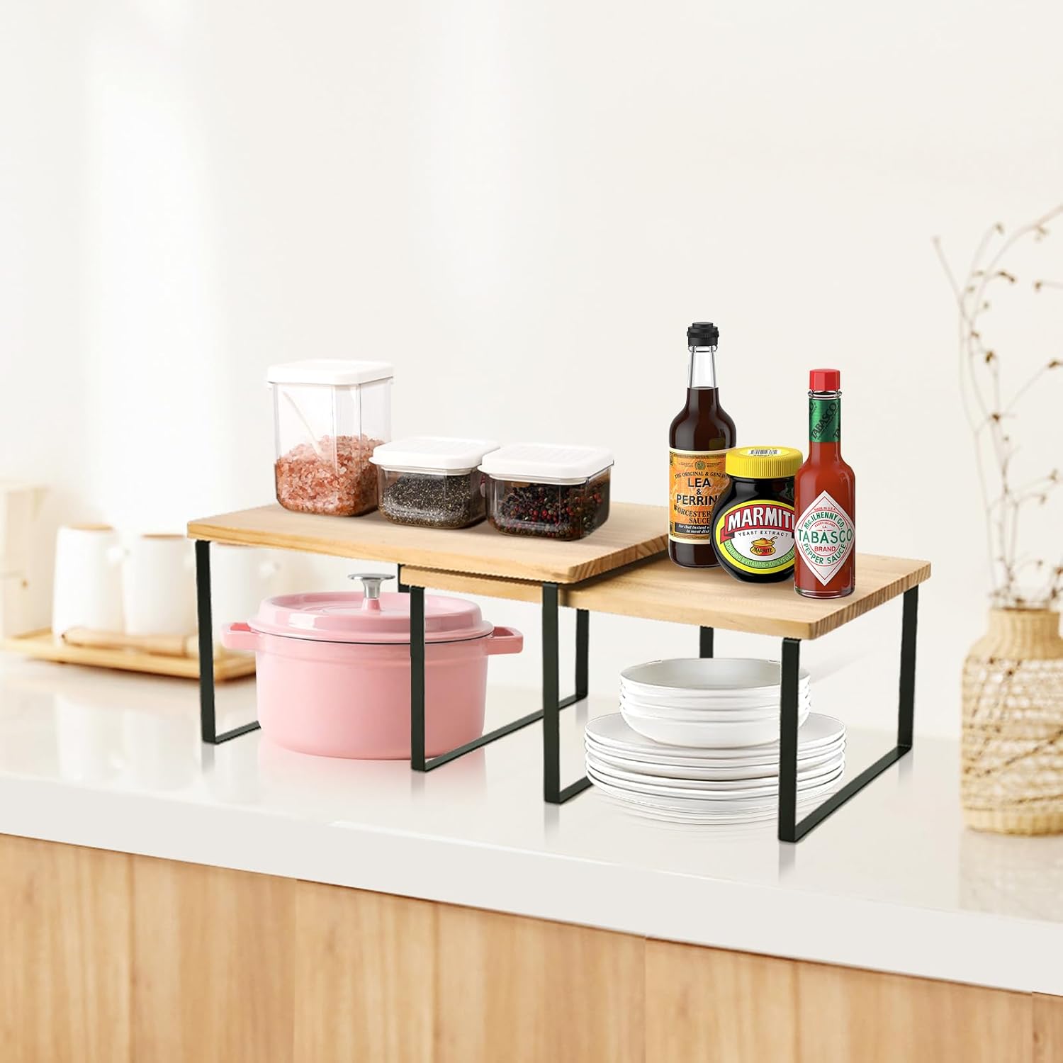 Bamber Large Cabinet Shelf Organizers Solid Wood Spice Rack Organizer for Cabinet Kitchen Countertop Storage, 16.5x10 Inches, Set of 2