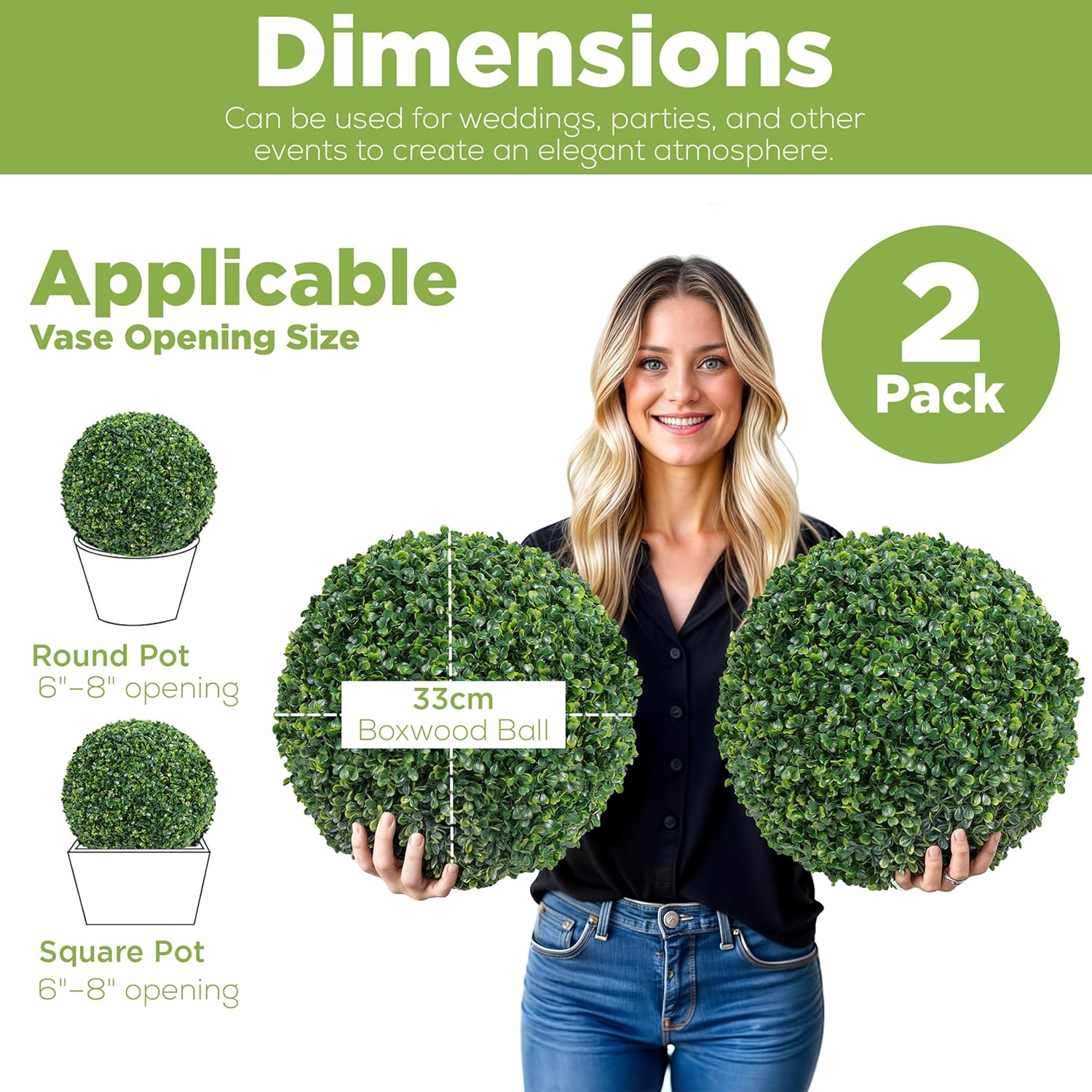 DRAY Premium 13" Faux Boxwood Balls – Set of 2 Artificial Topiary Spheres for Outdoor & Indoor Use – Realistic, UV-Resistant, Weatherproof Decorative Greenery – Check Measurements