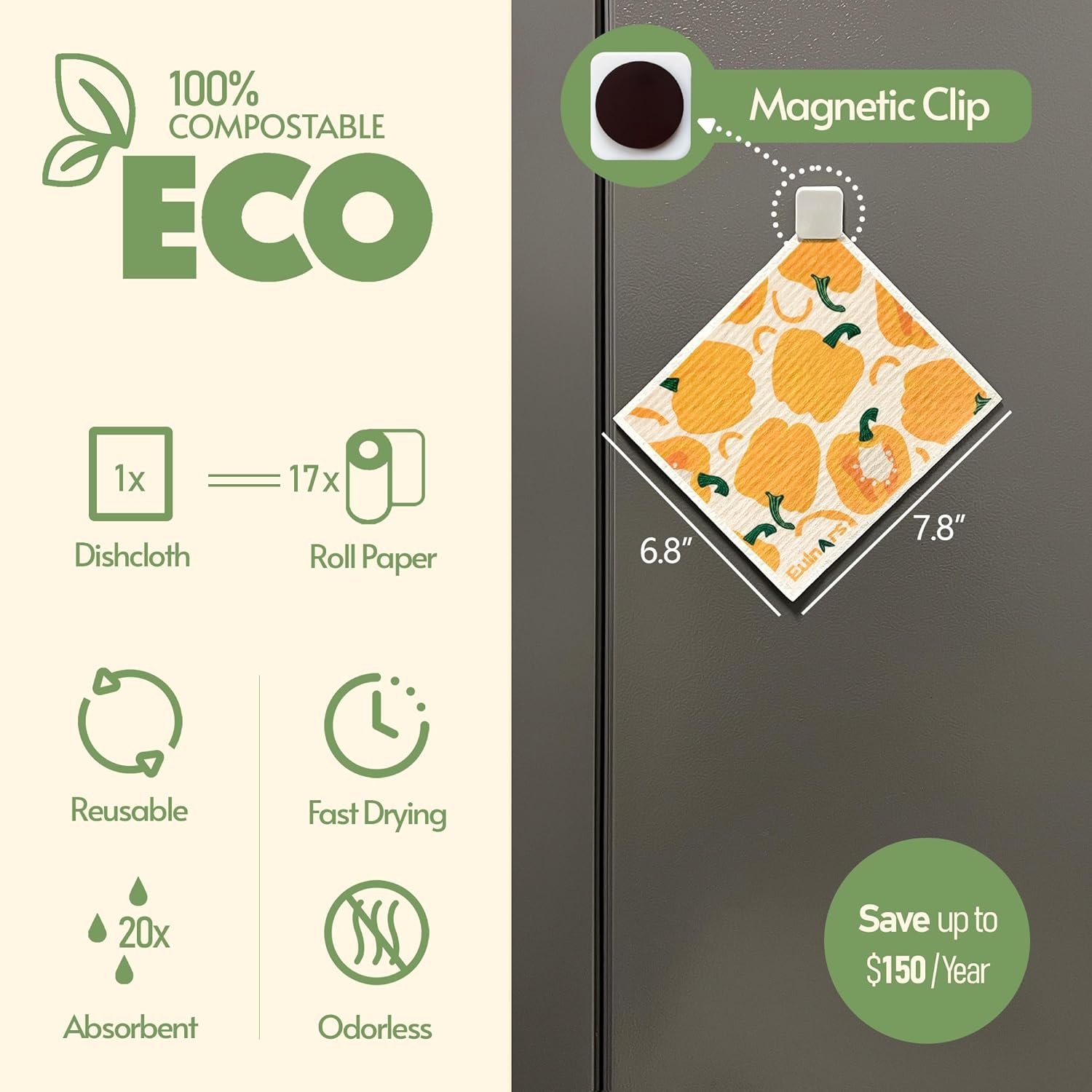 • Easy to Clean and Store: Our swedish dish cloths, measuring 7.8 x 6.8 inches, each set comes with 8 cellulose sponge cloths in 4 styles, along with 2 self-adhesive clips, 1 magnetic clip, and 9 labeling tags. Customize storage for easy access, hanging them on walls, counters, or refrigerators to keep your kitchen organized