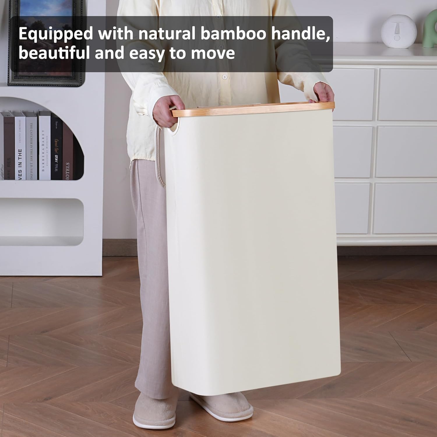 • 【Make Laundry Easier】The smooth bamboo handle ensures a comfortable grip without hurting your hands during use. The lid of the laundry basket is designed to prevent odor diffusion, providing you with a clean environment. It offers a larger capacity for storing and organizing clothes, helping you maintain a clean and tidy home or dormitory.