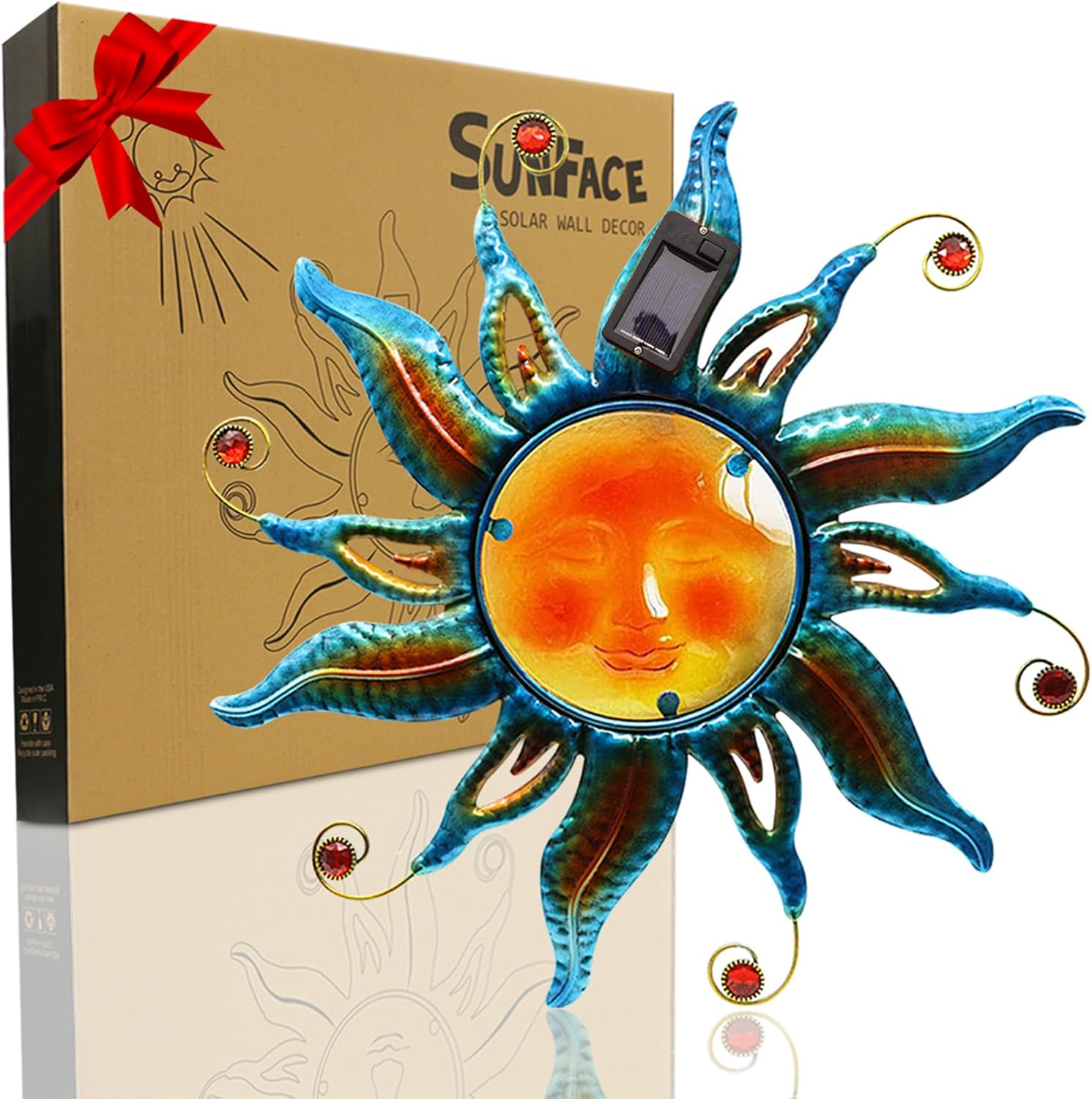 Goodeco Solar Sun Face Wall Art – Metal Outdoor Wall Decor with Solar LED Lights for Garden & Patio - Weather Resistant, Smiling Sun Face Design (18 inch, Blue)