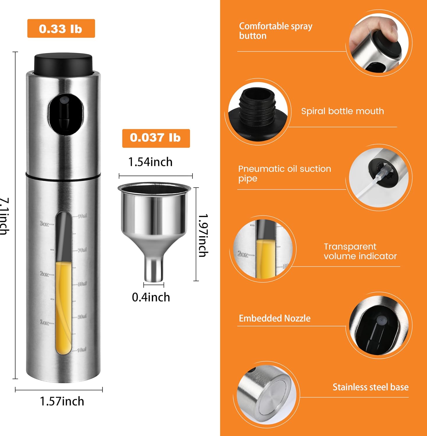 • Package Includes: 1 olive oil spray bottle, 1 stainless steel funnel. For better atomization, don’t fill to the top—leave some space for air pressure.