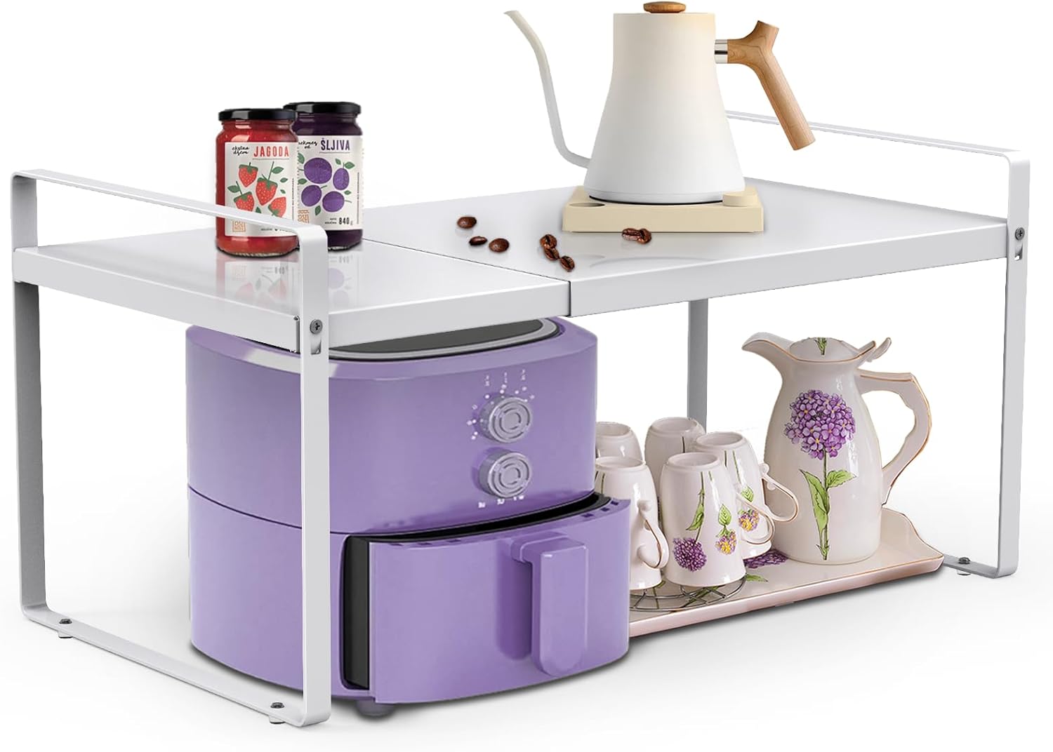 • Expandable:Use our expandable cabinet shelf organizer rack,you may expand the length of this freestanding cabinet shelf to your desires. Kitchen counter storage shelves stand can easily adjusted from 14 inches to 26 inches in length depending on how you want to organize your space. Specification:14 to 26 * 10 * 9 inches.The smooth surface of this cabinet shelf has been polished so it is for lifetime of use and does not wear out easily. Helps to create space and make your home more stylish at the same time