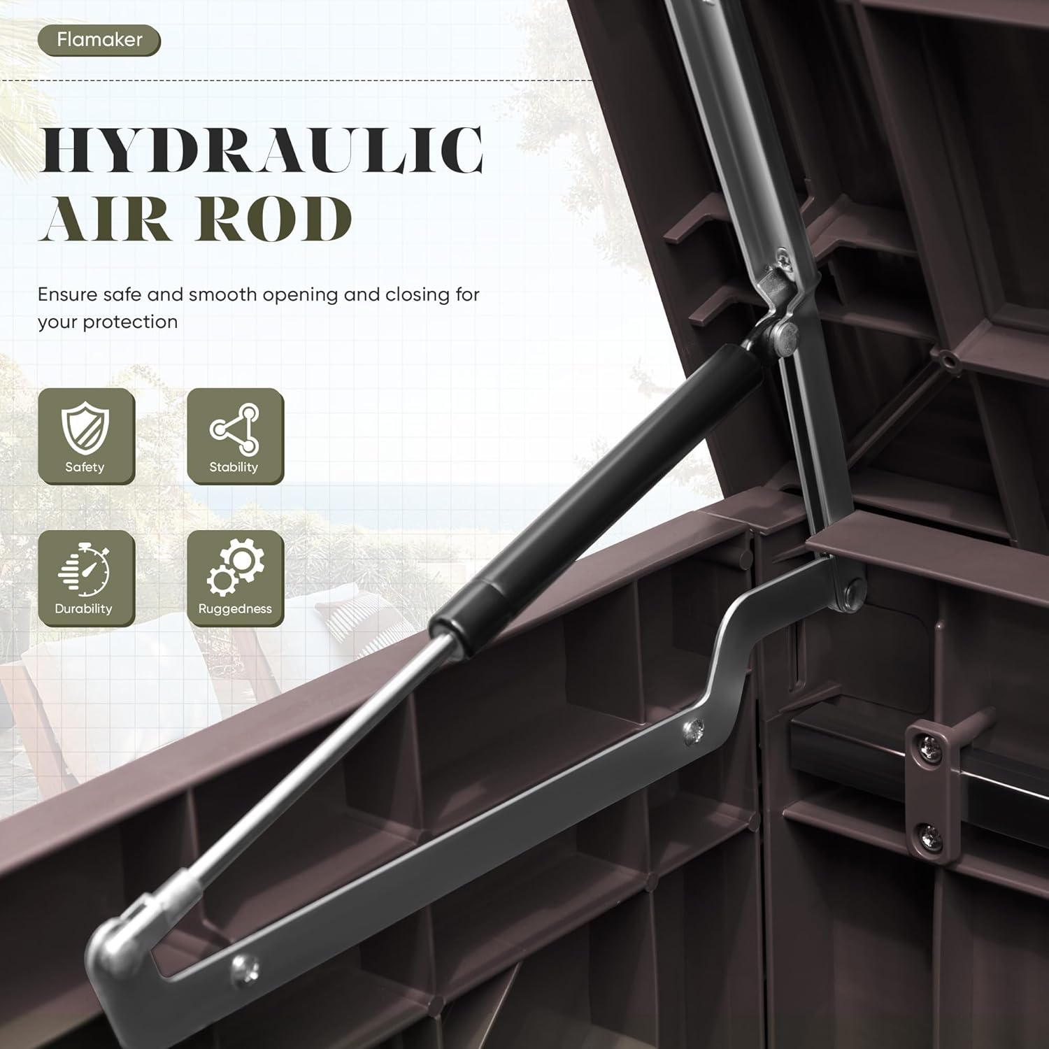 • [Safety Design] The storage box cover and the box are connected by hydraulic rods, which reduces the speed of opening and closing, ensuring the safety, and can be locked to ensure the safety of property