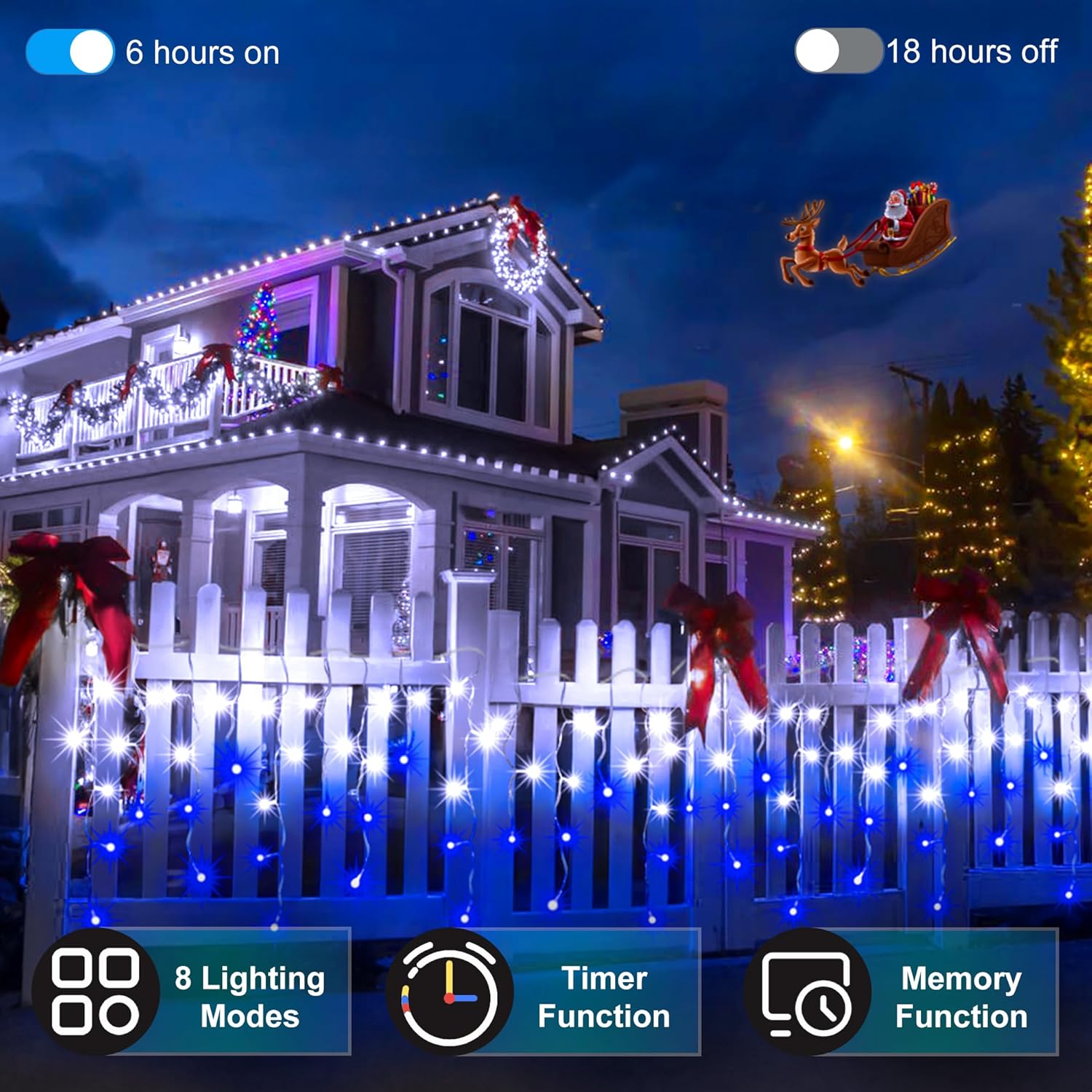 • Enjoy Hands-Free Holiday Magic: With the built-in timer feature, these outdoor christmas lights turn on and off automatically at the same time each day, freeing you from the hassle of manual operation. Set the perfect glow for your home to welcome family and friends, knowing the lights will illuminate your home like clockwork. The festive spirit never fades with this easy, hands-free function