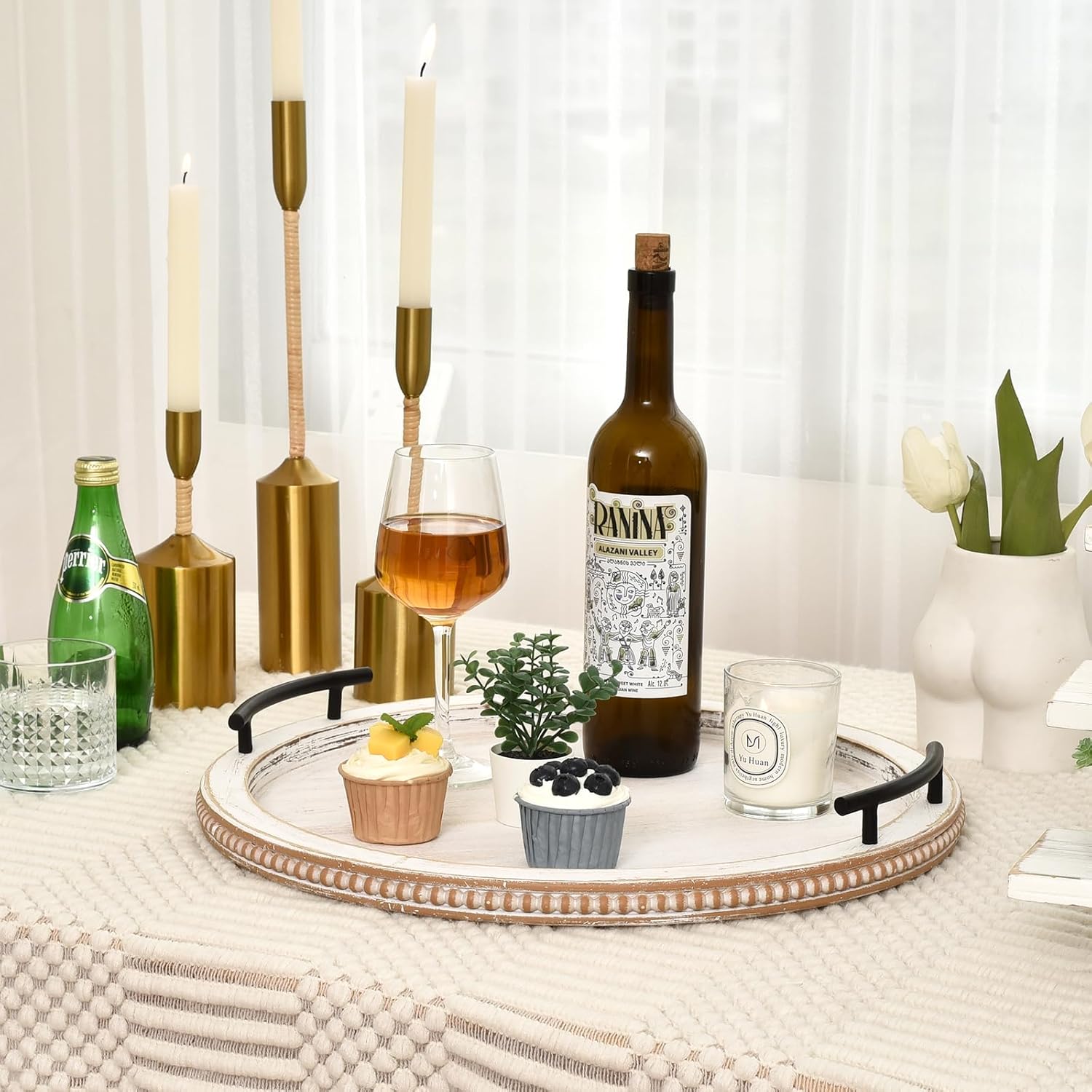 • ELEGANT ROUND DECORATIVE TRAY: Invite guests into your space with our stylish circular tray! This home decor accessory is adorned with unique wooden beads and features two robust metal handles for effortless handling.