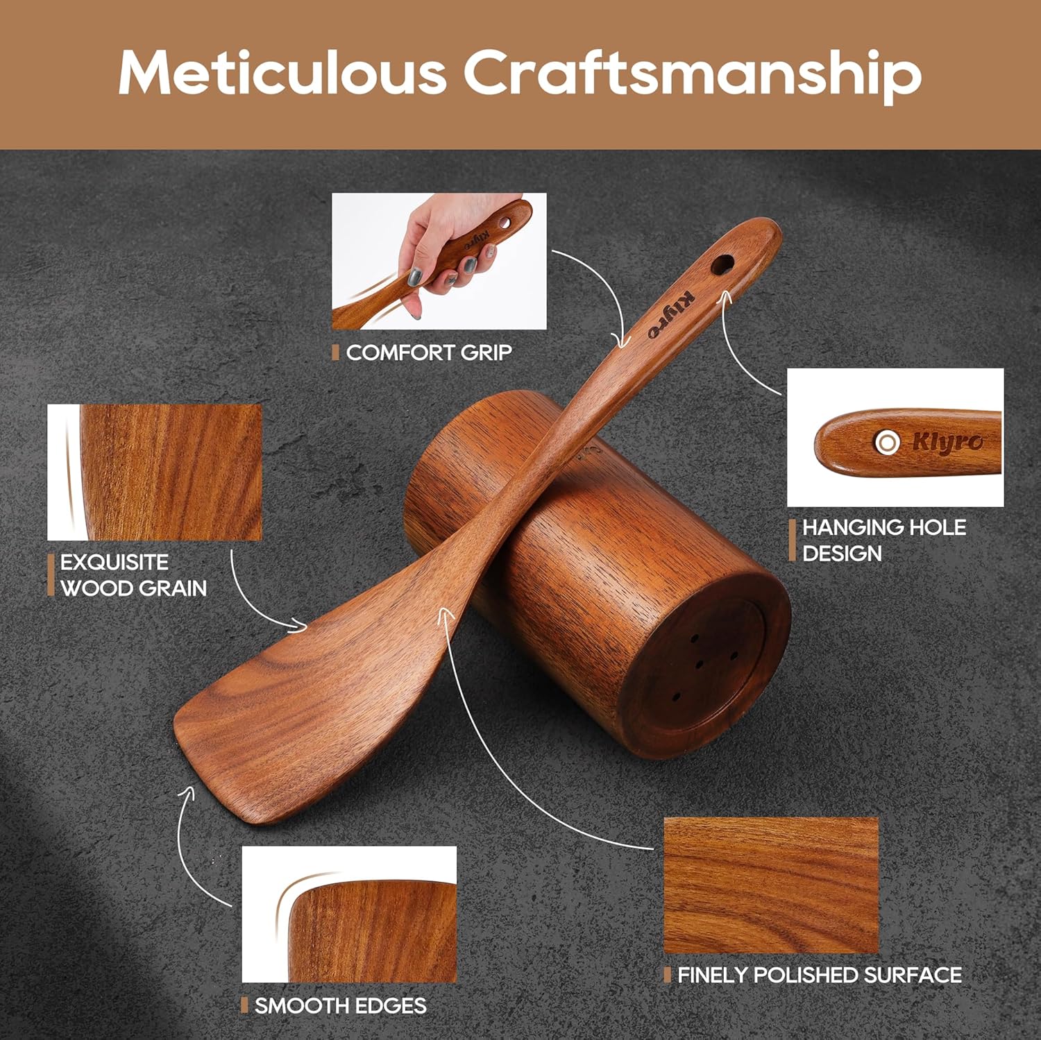 • Ergonomic Design for Comfortable Grip — The spatula set features an ergonomic handle for a comfortable grip. Once you use a KLYRO wooden spoons, you’ll be amazed by its thoughtful design. It is lightweight yet sturdy, reducing hand fatigue during prolonged use, making stirring and serving easy and enjoyable, enhancing your cooking experience.