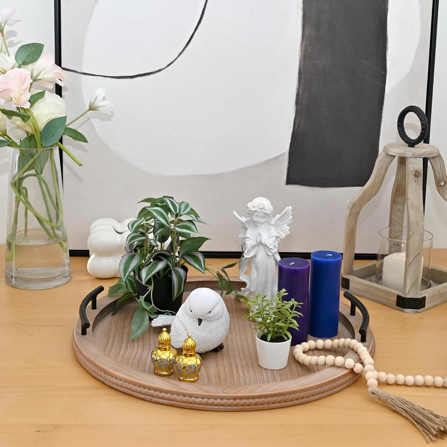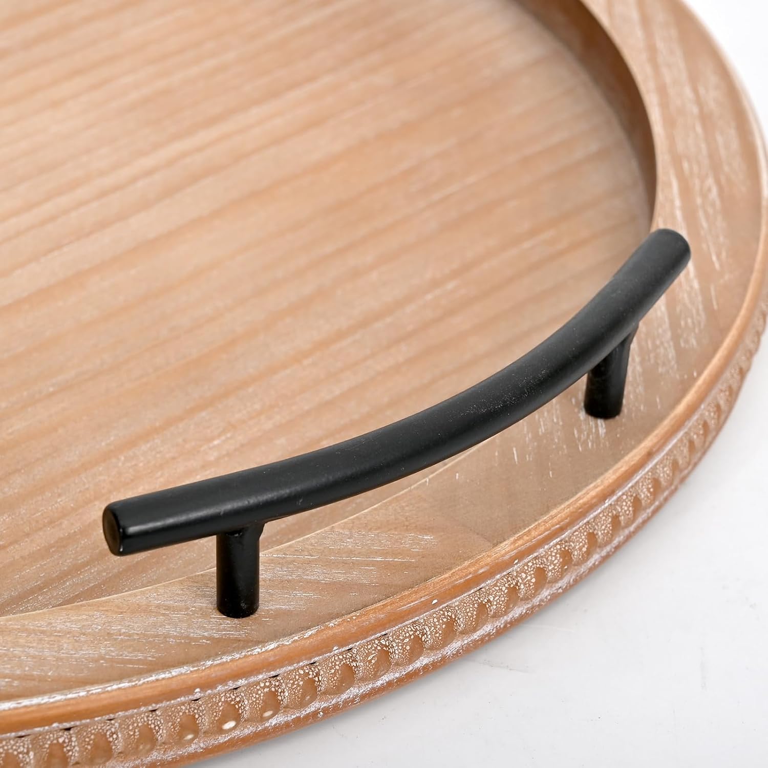 • ELEGANT ROUND DECORATIVE TRAY: Invite guests into your space with our stylish circular tray! This home decor accessory is adorned with unique wooden beads and features two robust metal handles for effortless handling.