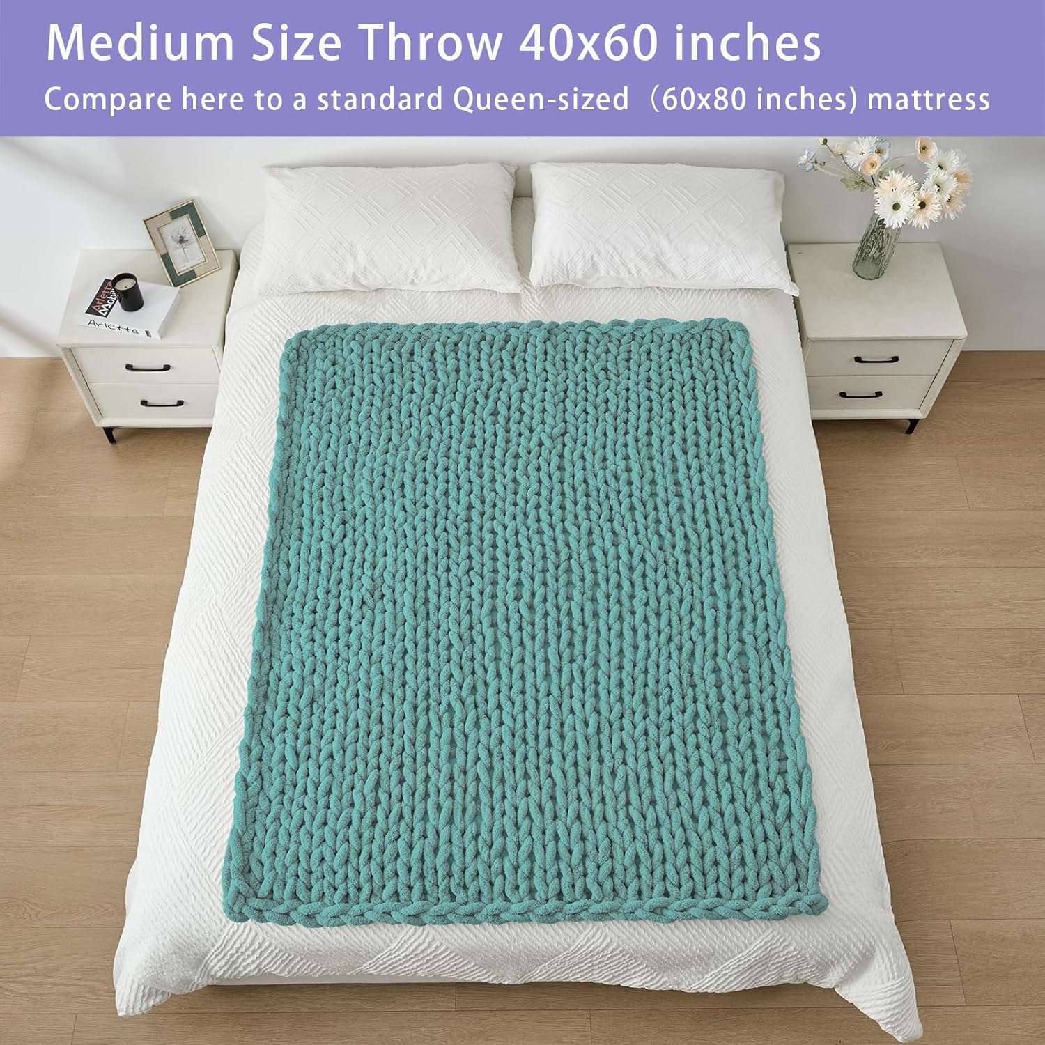 Bigacogo Chunky Knit Throw Blanket for Couch, 40x60 inches, 100% Hand Knitted with Thick Jumbo Chenille Yarn, Cozy Soft Large Rope Knot Cable Crochet Blankets for Sofa Bed Living Room, Light Teal