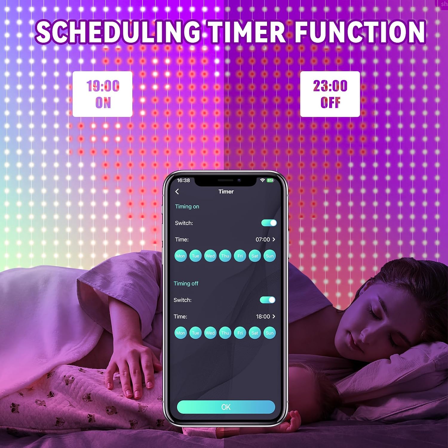 • Series Connection and Timer: Connect up to 3 sets of smart curtain lights through the app to create a larger light screen that can be controlled simultaneously, perfect for covering a wider area; The built-in timer lets you schedule the lights to turn on and off automatically, just like setting an alarm clock, offering hands-free convenience
