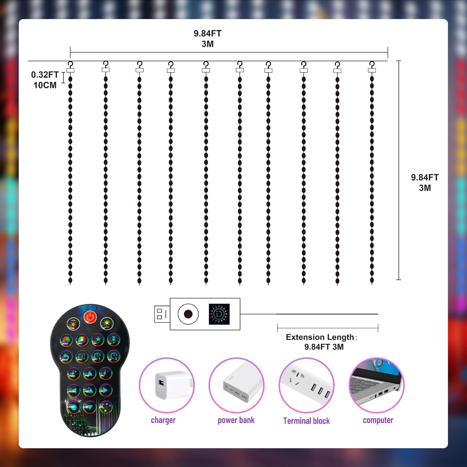 • Smart Curtain Lights: 6.6 x 6.6Ft, 400LEDs USB Powered smart curtains lights come with 10ft long power cord; 6.6ft main strand and 20 drop strings with hooks; Easily control the lights in the room with just a few taps on your phone or remote; Waterproof and ideal for bedrooms, living rooms, gaming rooms, garages, banquet halls, cafes, exterior walls, and windows.