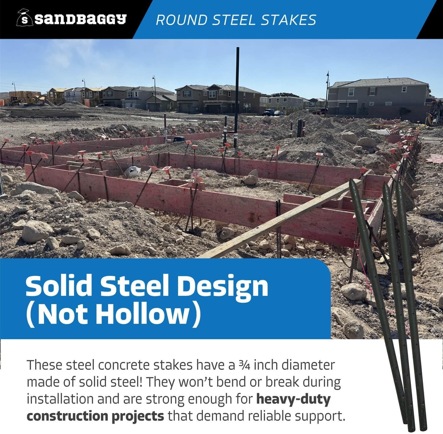 • SOLID STEEL DESIGN (NOT HOLLOW): These steel concrete stakes have a ¾ inch diameter made of solid steel! They won’t bend or break during installation and are strong enough for heavy-duty construction projects that demand reliable support.