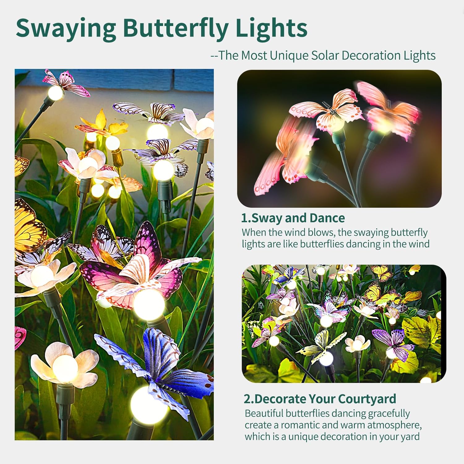 • 【SWAVING BUTTERFLIES,THE MOST BEAUTIFUL BUTTERFFLY DECORATION 】 The solar outdoor lights can emit warm white soft light, creating a romantic and festive atmosphere. They are the perfect outdoor decor for garden, courtyard, lawn, pathway, as well as any occasion such as Christmas, weddings, New Year's, parties, etc.