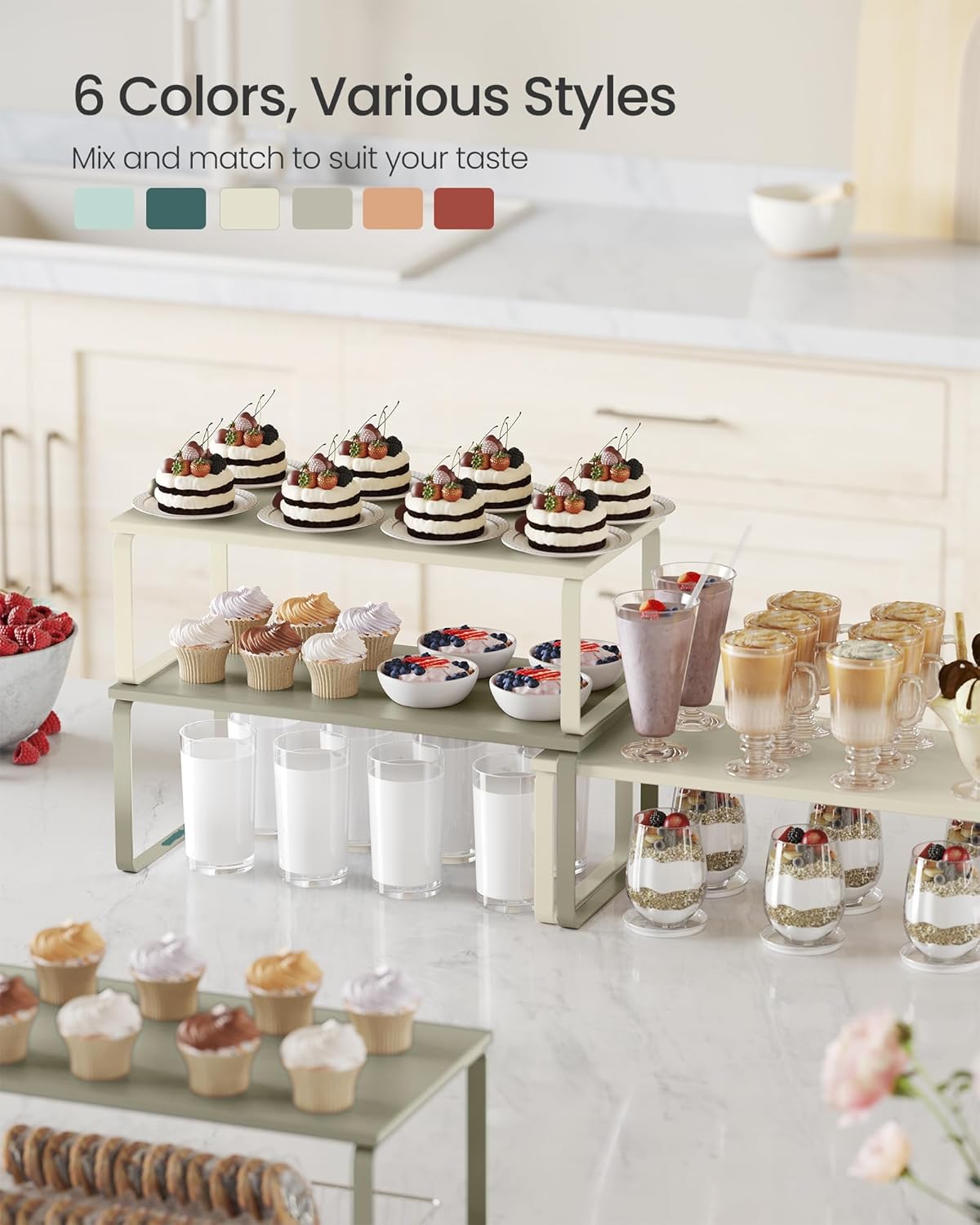 SONGMICS Cabinet Organizer Shelf, Set of 2 Kitchen Counter Shelves, Kitchen Storage, Spice Rack, Stackable, Expandable, Metal and Engineered Wood, Cream White UKCS200W02