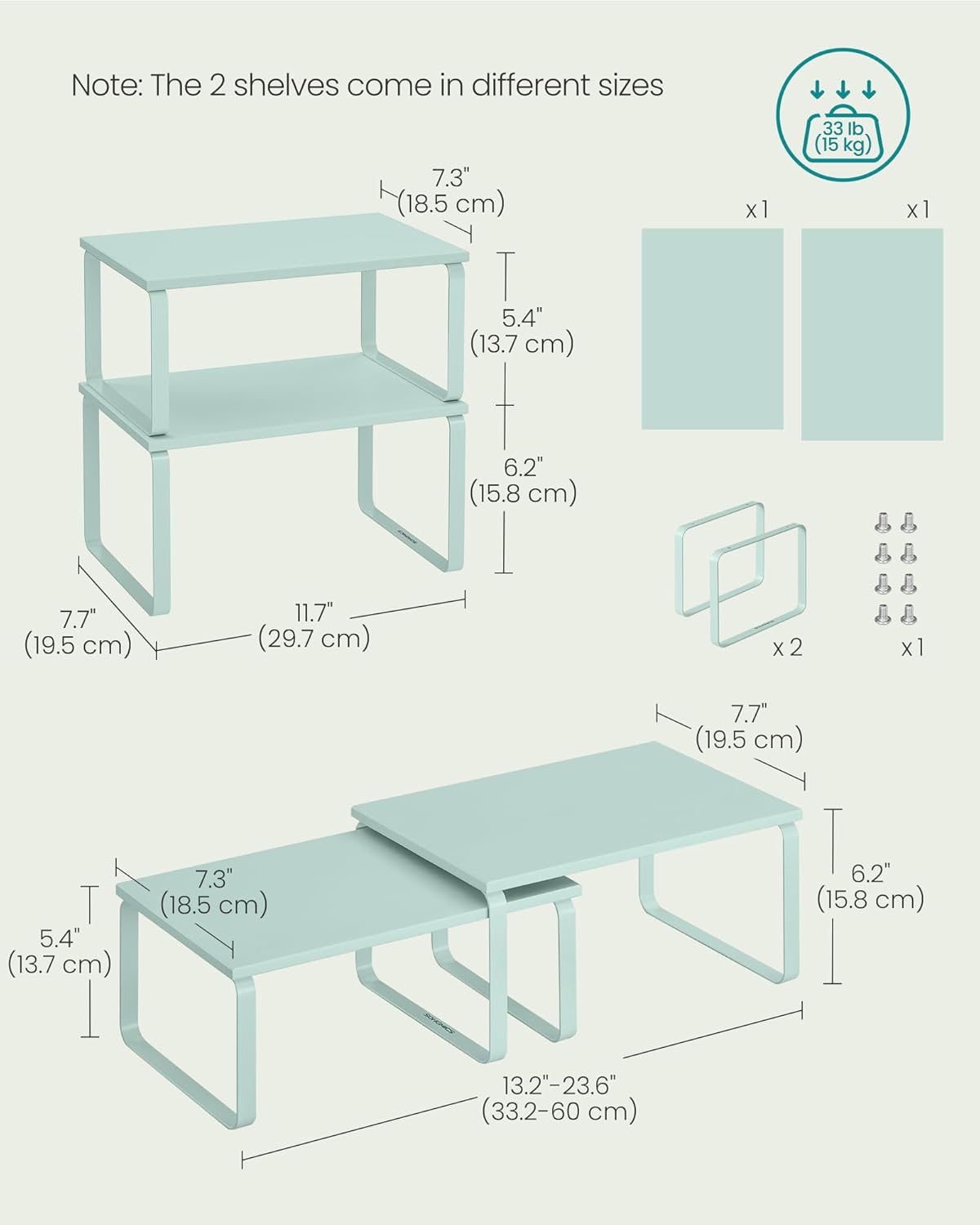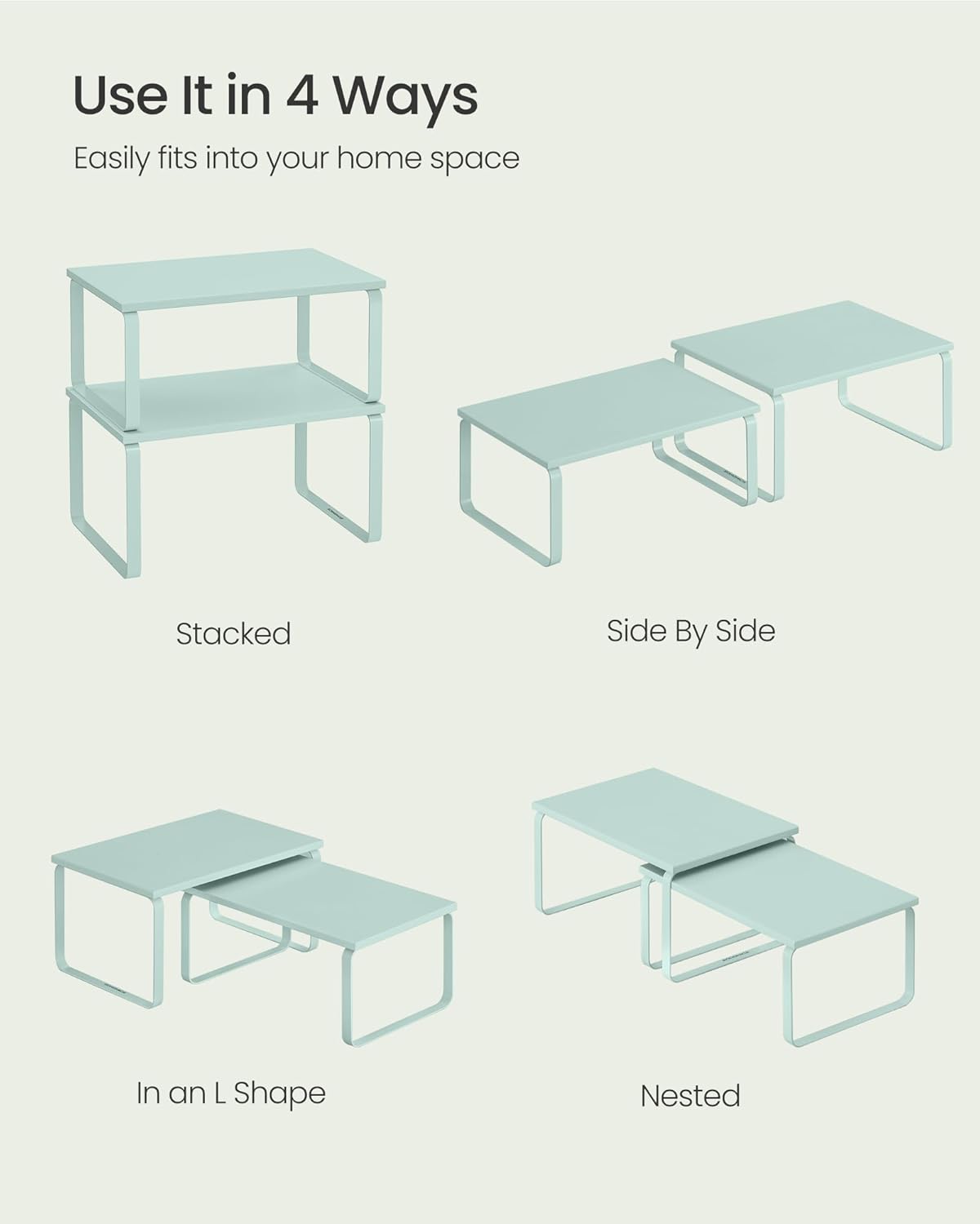 • [Adjustable] With their unique design, with one slightly smaller than the other, these shelf organizers can be stacked on top of one another, nested, used separately, or even in an L-shape. Adjust them how you want to perfectly fit your kitchen space